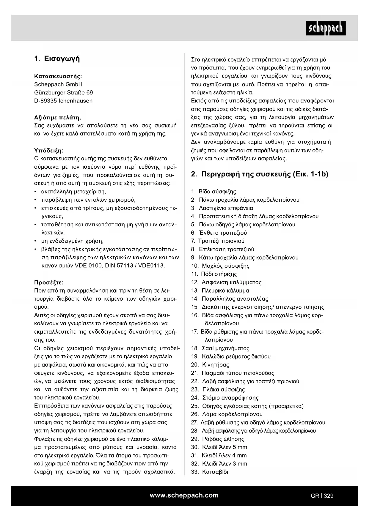 Κατασκευαστής: Scheppach GmbH Günzburger Straße 69 D-89335 Ichenhausen Αξιότιμε πελάτη, Σας ευχόμαστε να απολαύσετε τη νέα σας συσκευή και να έχετε καλά αποτελέσματα κατά τη χρήση της.