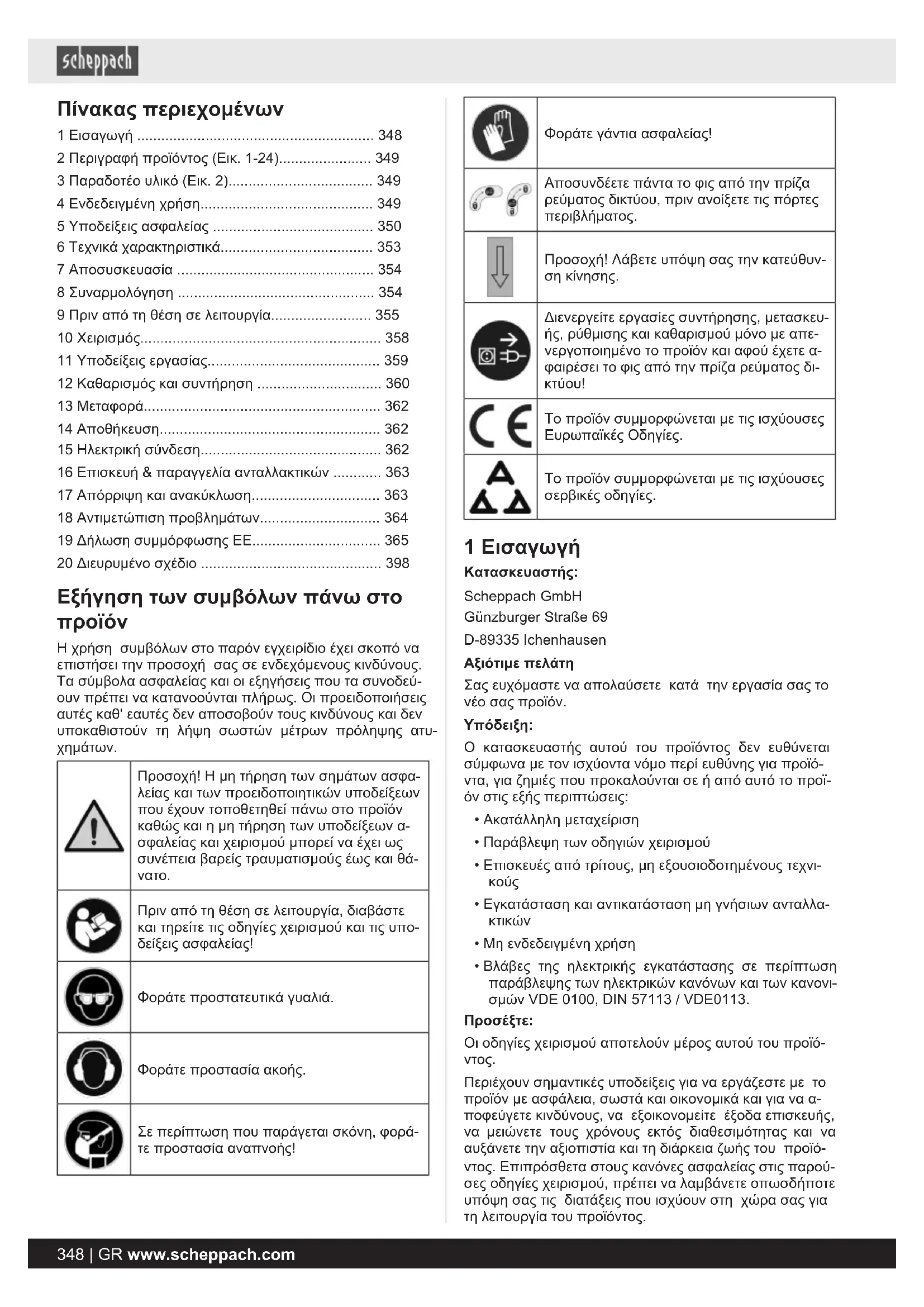 Περιέχουν σημαντικές υποδείξεις για να εργάζεστε με το προϊόν με ασφάλεια, σωστά και οικονομικά και για να α- ποφεύγετε κινδύνους, να εξοικονομείτε έξοδα επισκευής, να μειώνετε τους χρόνους εκτός διαθεσιμότητας και να αυξάνετε την αξιοπιστία και τη διάρκεια ζωής του προϊό- ντος. Επιπρόσθετα στους κανόνες ασφαλείας στις παρού- σες οδηγίες χειρισμού, πρέπει να λαμβάνετε οπωσδήποτε υπόψη σας τις διατάξεις που ισχύουν στη χώρα σας για τη λειτουργία του προϊόντος. 348 | GR www.scheppach.comΠριν τη χρήση του προϊόντος εξοικειωθείτε με όλες τις υ- ποδείξεις χειρισμού και ασφαλείας. Χρησιμοποιείτε το προϊόν μόνον όπως περιγράφεται και για τους αναφερό- μενους τομείς χρήσης. Φυλάξτε με ασφάλεια τις οδηγίες χειρισμού και σε περίπτωση μεταβίβασης του προϊόντος παραδώστε μαζί και όλα τα έγγραφα. 2 Περιγραφή προϊόντος (Εικ.1-24)