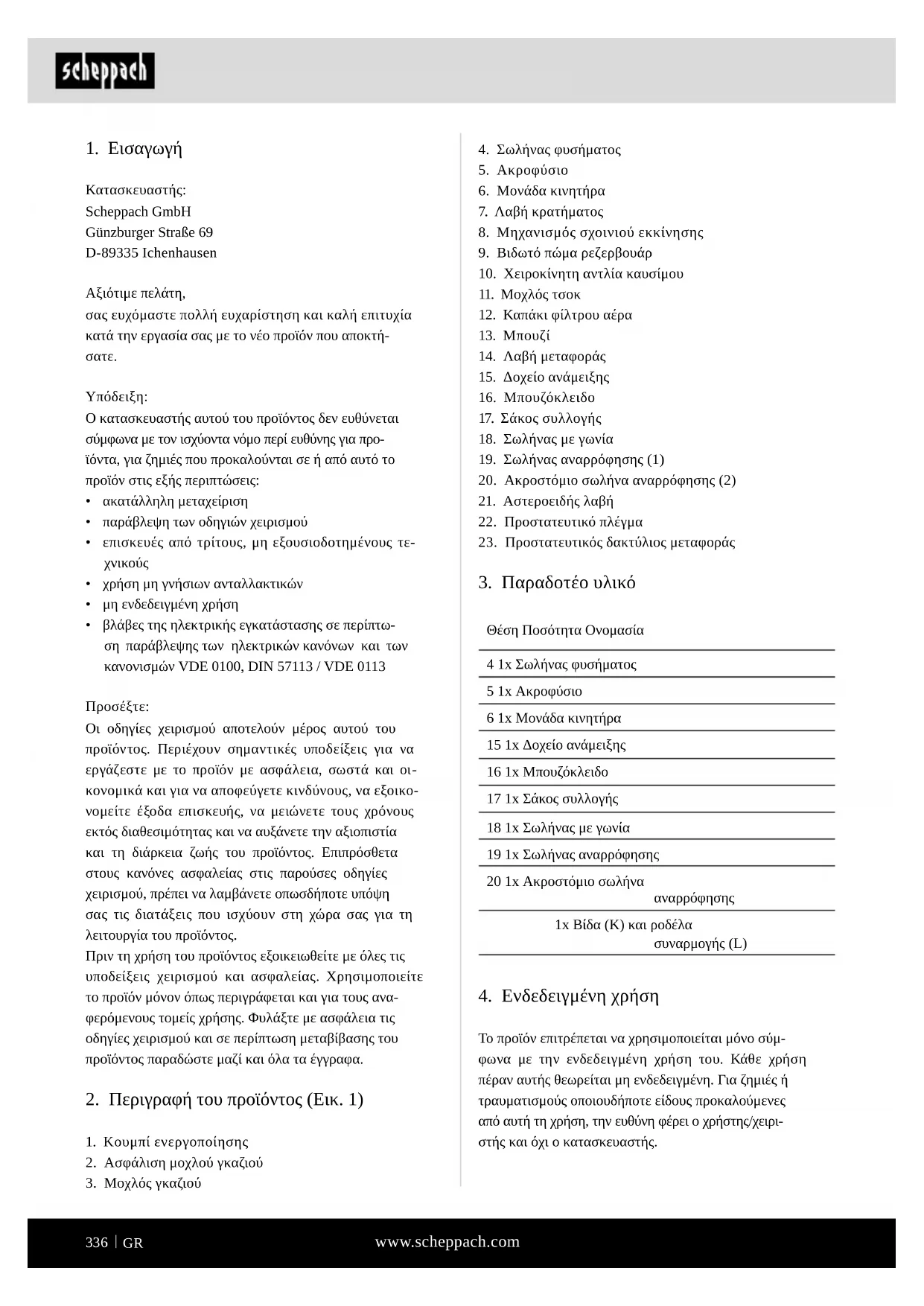 Από παραλείψεις στην τήρηση των ακόλουθων οδη- γιών ενδέχεται να προκληθεί ηλεκτροπληξία, φωτιά και/ή σοβαροί τραυματισμοί. Φυλάξτε όλες τις υποδείξεις ασφαλείας και τις οδηγίες για μελλοντική χρήση.www.scheppach.com
