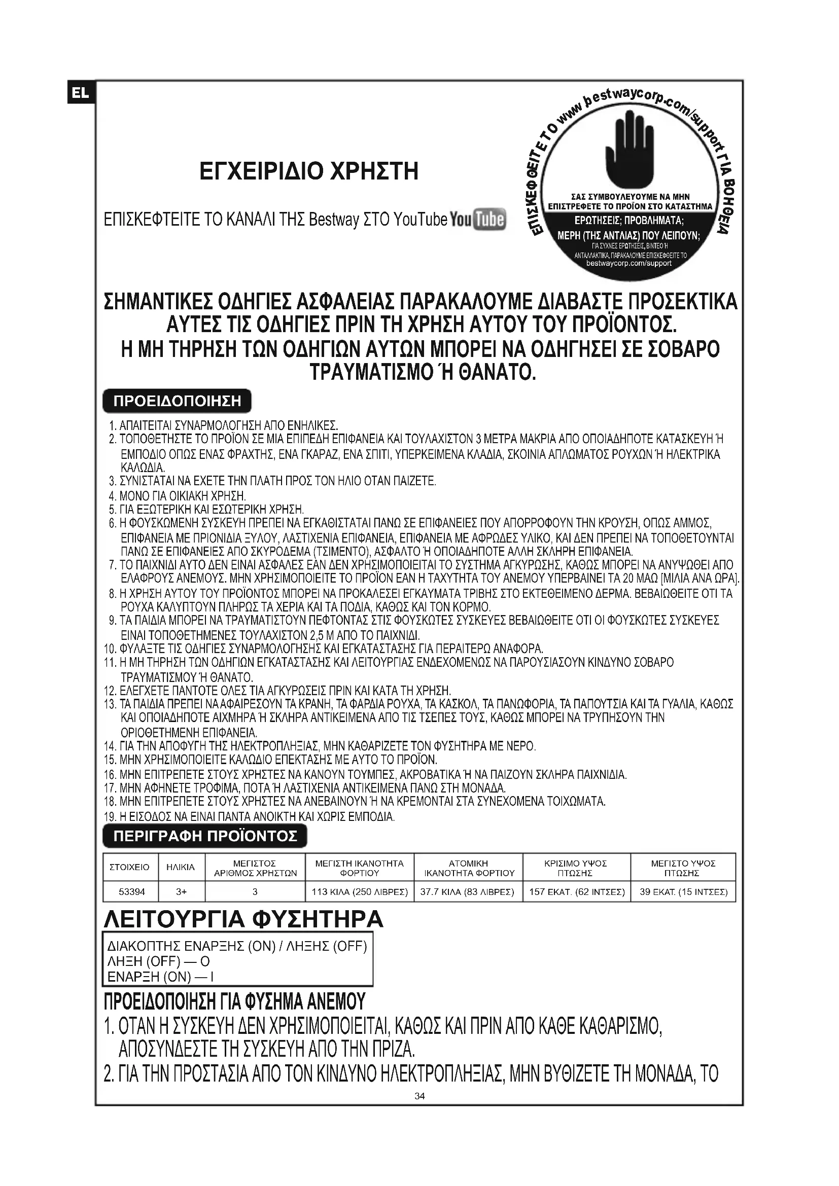 ΕΠΙΣΚΕΦΤΕΙΤΕ ΤΟ ΚΑΝΑΛΙ ΤΗΣ Bestway ΣΤΟ YouTube ΣΑΣ ΣΥΜΒΟΥΛΕΥΟΥΜΕ ΝΑ ΜΗΝΕΠΙΣΤΡΕΦΕΤΕ ΤΟ ΠΡΟΪΟΝ ΣΤΟ ΚΑΤΑΣΤΗΜΑΕΡΩΤΗΣΕΙΣ; ΠΡΟΒΛΗΜΑΤΑ;ΜΕΡΗ (ΤΗΣ ΑΝΤΛΙΑΣ) ΠΟΥ ΛΕΙΠΟΥΝ; ΓΙΑ ΣΥΧΝΕΣ ΕΡΩΤΗΣΕΙΣ, ΒΙΝΤΕΟ Ή ΑΝΤΑΛΛΑΚΤΙΚΑ, ΠΑΡΑΚΑΛΟΥΜΕ ΕΠΙΣΚΕΦΘΕΙΤΕ ΤΟ bestwaycorp.com/support