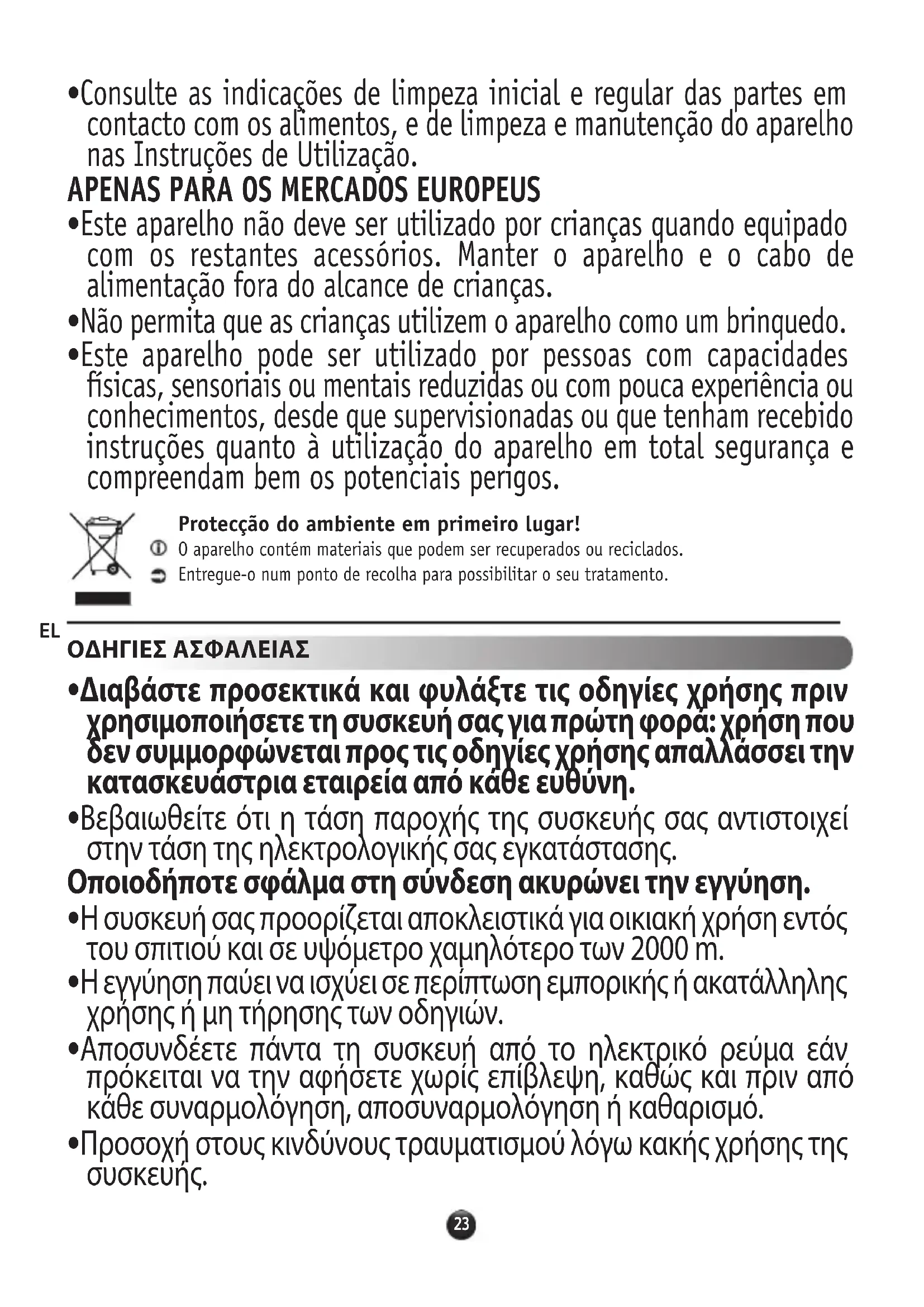 - Ανατρέξτε στις οδηγίες χρήσης για τον αρχικό και τακτικό καθαρισμό των μερών που έρχονται σε επαφή με τα τρόφιμα, καθώς και για τον καθαρισμό και τη συντήρηση της συσκευής σας. ΜΟΝΟΝ ΓΙΑ ΤΙΣ ΕΥΡΩΠΑΙΚΕΣ ΑΓΟΡΕΣ