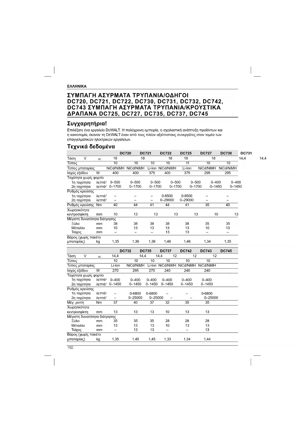 Συγχαρητήρια! Επιλέξατε ένα εργαλείο DEWALT. Η πολύχρονη εμπειρία, η σχολαστική ανάπτυξη προϊόντων και η καινοτομία, έκαναν τη DEWALT έναν από τους πλέον αξιόπιστους συνεργάτες στον τομέα των επαγγελματικών ηλεκτρικών εργαλείων. Τεχνικά δεδομένα DC720 DC721 DC722 DC725 DC727 DC730 DC731 Τάση V