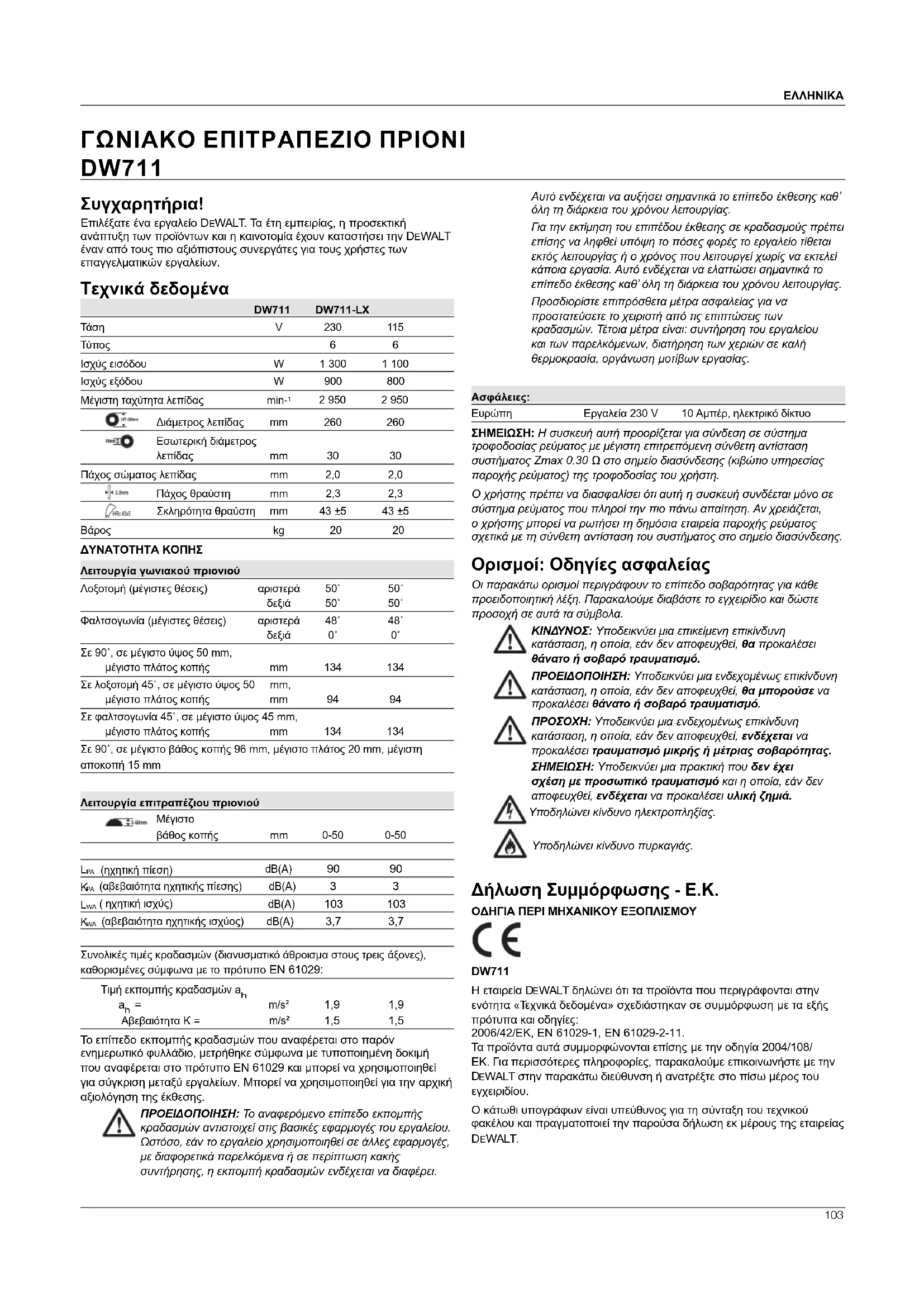 EWALT στην παρακάτω διεύθυνση ή ανατρέξτε στο πίσω μέρος του εγχειριδίου. Ο κάτωθι υπογράφων είναι υπεύθυνος για τη σύνταξη του τεχνικού φακέλου και πραγματοποιεί την παρούσα δήλωση εκ μέρους της εταιρείας DEWALT. Συγχαρητήρια! Επιλέξατε ένα εργαλείο DEWALT. Τα έτη εμπειρίας, η προσεκτική ανάπτυξη των προϊόντων και η καινοτομία έχουν καταστήσει την DEWALT έναν από τους πιο αξιόπιστους συνεργάτες για τους χρήστες των επαγγελματικών εργαλείων. Τεχνικά δεδομένα DW711 DW711-LX Τάση V 230 115 Τύπος 6 6 Ισχύς εισόδου W 1 300 1 100 Ισχύς εξόδου W 900 800 Μέγιστη ταχύτητα λεπίδας min-