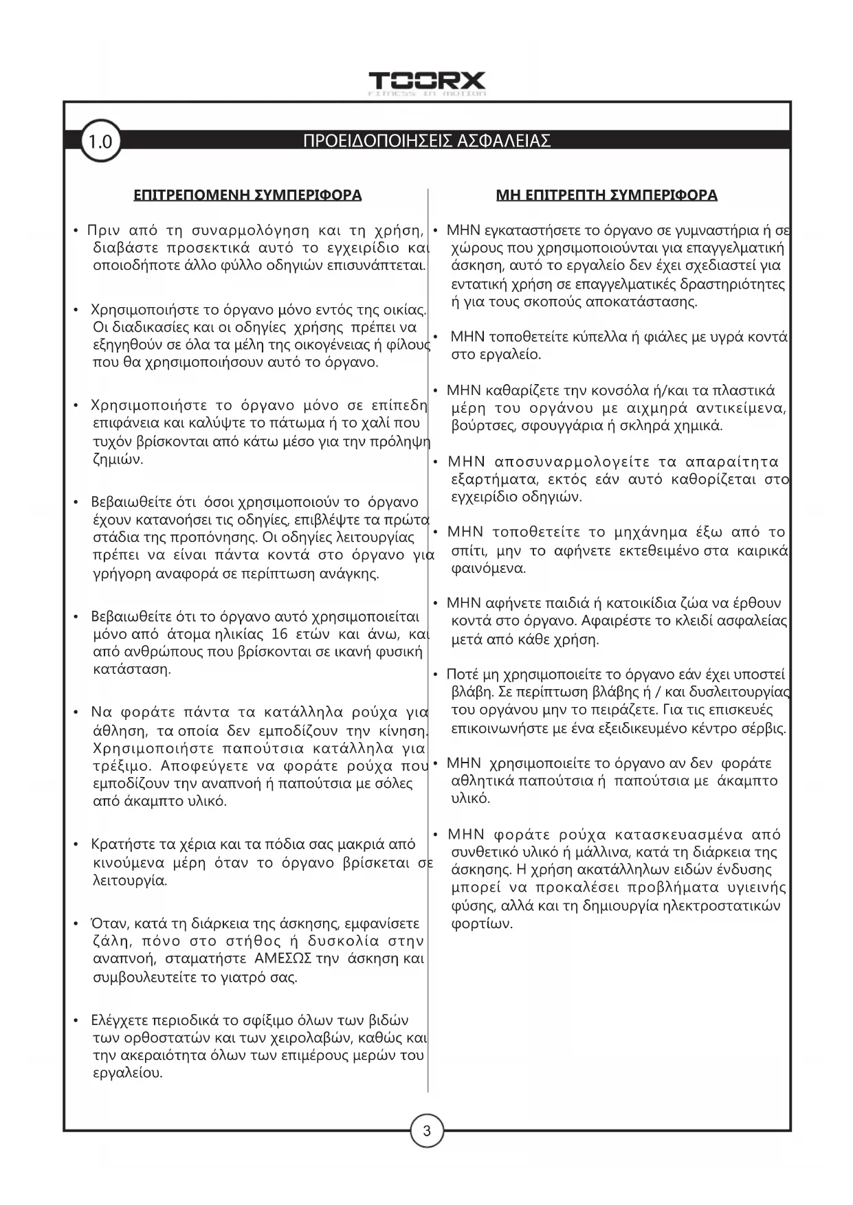 Το προϊόν TOORX που αγοράσατε, έχει κατασκευαστεί για να σας προσφέρει απροβλημάτιστη λειτουργία για πολλά χρόνια. Όπως όμως κάθε ηλεκτρική συσκευή, έτσι και η δική σας χρειάζεται μεγάλη προσοχή κατα τη διάρκεια της χρήσης και του χειρισμού της. Εάν της φερθείτε με τη δέουσα προσοχή, θα γίνει ο προσωπικό σας γυμναστής για μια ζωή. Μεγάλη προσοχή απαιτείται: