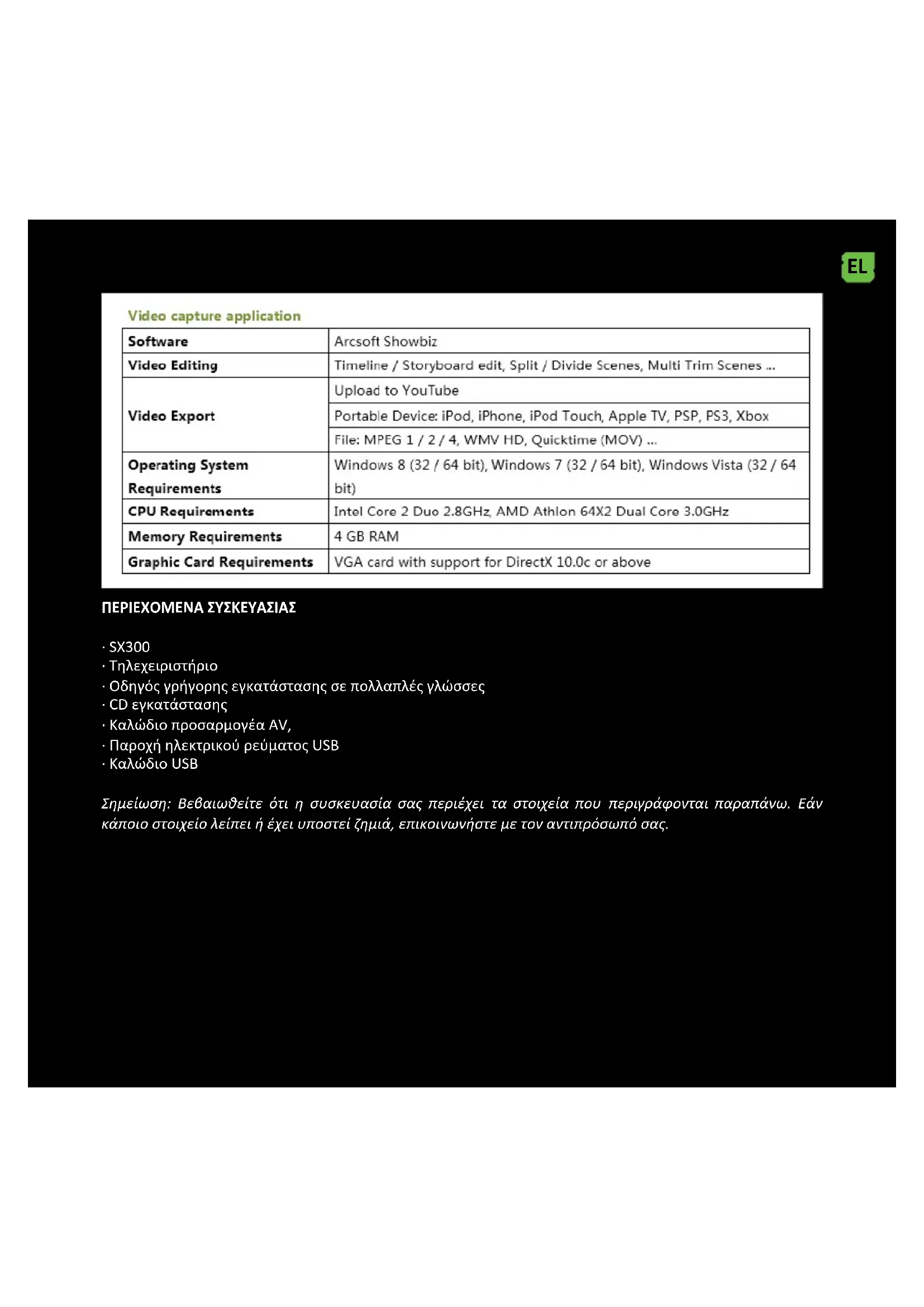 Αυτό το βίντεο συλλαμβάνει έχει 3 λειτουργίες εισαγωγής: HDMI, component, composite. Και θα αναγνωρίσει αυτόματα την πηγή εισόδου βίντεο, δεν υπάρχει καμία ανάγκη να αλλάξετε χειροκίνητα την πηγή. Ποτέ μη συνδέετε 2 ή 3 πηγή ταυτόχρονα.ΣΥΝΔΕΣΗ HDMI EL1. Συνδέστε το παρεχόμενο καλώδιο USB μεταξύ του τροφοδοτικού και την είσοδο PRW του SX300 και συνδέστε το τροφοδοτικό σε μια πρίζα στο σπίτι.