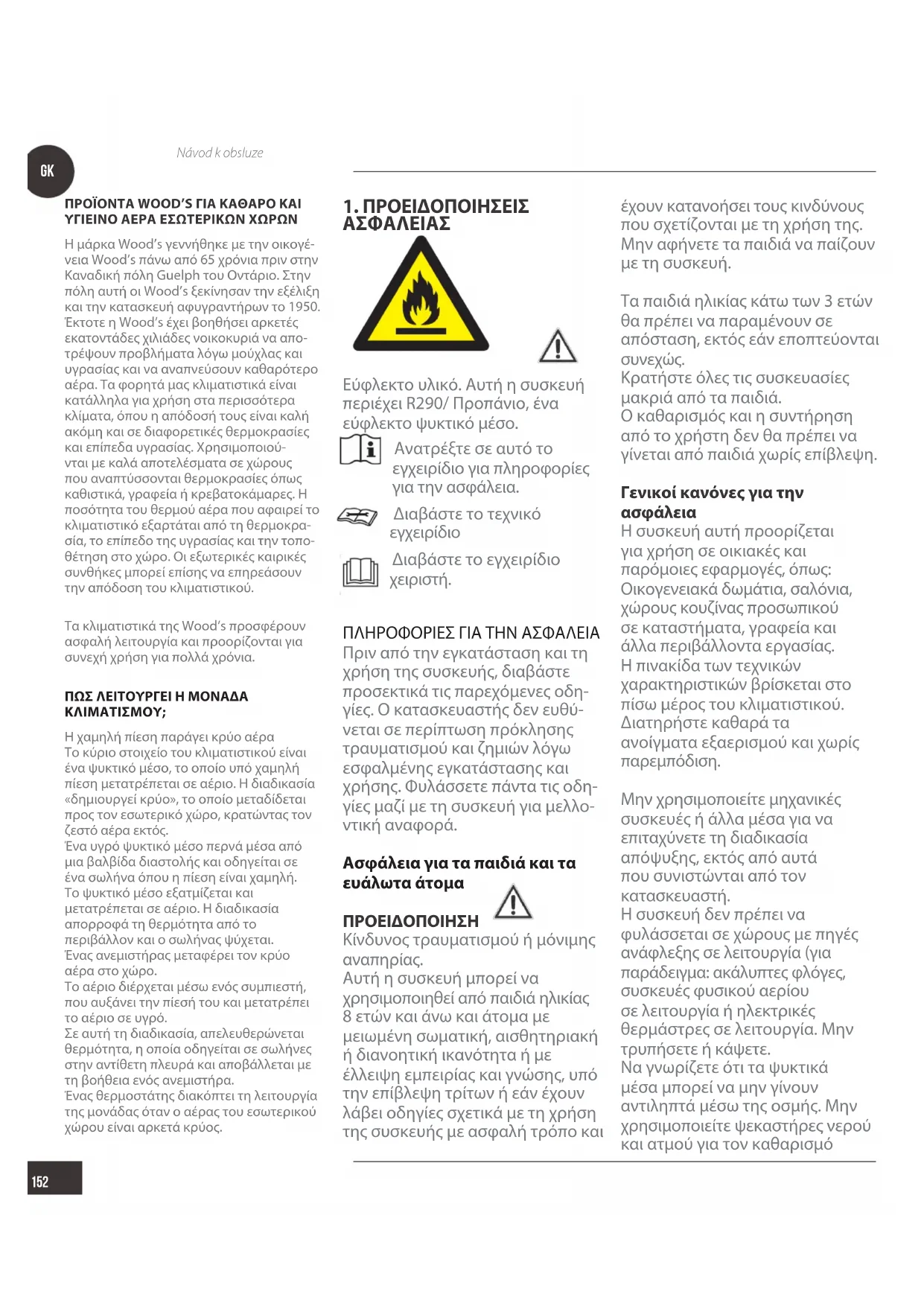 Návod k obsluze ΠΡΟΪΟΝΤΑ WOOD’S ΓΙΑ ΚΑΘΑΡΟ ΚΑΙ ΥΓΙΕΙΝΟ ΑΕΡΑ ΕΣΩΤΕΡΙΚΩΝ ΧΩΡΩΝ Η μάρκα Wood’s γεννήθηκε με την οικογέ- νεια Wood’s πάνω από 65 χρόνια πριν στην Καναδική πόλη Guelph του Οντάριο. Στην πόλη αυτή οι Wood’s ξεκίνησαν την εξέλιξη και την κατασκευή αφυγραντήρων το 1950. Έκτοτε η Wood’s έχει βοηθήσει αρκετές εκατοντάδες χιλιάδες νοικοκυριά να απο- τρέψουν προβλήματα λόγω μούχλας και υγρασίας και να αναπνεύσουν καθαρότερο αέρα. Τα φορητά μας κλιματιστικά είναι κατάλληλα για χρήση στα περισσότερα κλίματα, όπου η απόδοσή τους είναι καλή ακόμη και σε διαφορετικές θερμοκρασίες και επίπεδα υγρασίας. Χρησιμοποιού- νται με καλά αποτελέσματα σε χώρους που αναπτύσσονται θερμοκρασίες όπως καθιστικά, γραφεία ή κρεβατοκάμαρες. Η ποσότητα του θερμού αέρα που αφαιρεί το κλιματιστικό εξαρτάται από τη θερμοκρα- σία, το επίπεδο της υγρασίας και την τοπο- θέτηση στο χώρο. Οι εξωτερικές καιρικές συνθήκες μπορεί επίσης να επηρεάσουν την απόδοση του κλιματιστικού. Τα κλιματιστικά της Wood’s προσφέρουν ασφαλή λειτουργία και προορίζονται για συνεχή χρήση για πολλά χρόνια. ΠΩΣ ΛΕΙΤΟΥΡΓΕΙ Η ΜΟΝΑΔΑ ΚΛΙΜΑΤΙΣΜΟΥ; Η χαμηλή πίεση παράγει κρύο αέρα Το κύριο στοιχείο του κλιματιστικού είναι ένα ψυκτικό μέσο, το οποίο υπό χαμηλή πίεση μετατρέπεται σε αέριο. Η διαδικασία «δημιουργεί κρύο», το οποίο μεταδίδεται προς τον εσωτερικό χώρο, κρατώντας τον ζεστό αέρα εκτός. Ένα υγρό ψυκτικό μέσο περνά μέσα από μια βαλβίδα διαστολής και οδηγείται σε ένα σωλήνα όπου η πίεση είναι χαμηλή. Το ψυκτικό μέσο εξατμίζεται και μετατρέπεται σε αέριο. Η διαδικασία απορροφά τη θερμότητα από το περιβάλλον και ο σωλήνας ψύχεται. Ένας ανεμιστήρας μεταφέρει τον κρύο αέρα στο χώρο. Το αέριο διέρχεται μέσω ενός συμπιεστή, που αυξάνει την πίεσή του και μετατρέπει το αέριο σε υγρό. Σε αυτή τη διαδικασία, απελευθερώνεται θερμότητα, η οποία οδηγείται σε σωλήνες στην αντίθετη πλευρά και αποβάλλεται με τη βοήθεια ενός ανεμιστήρα. Ένας θερμοστάτης διακόπτει τη λειτουργία της μονάδας όταν ο αέρας του εσωτερικού χώρου είναι αρκετά κρύος.