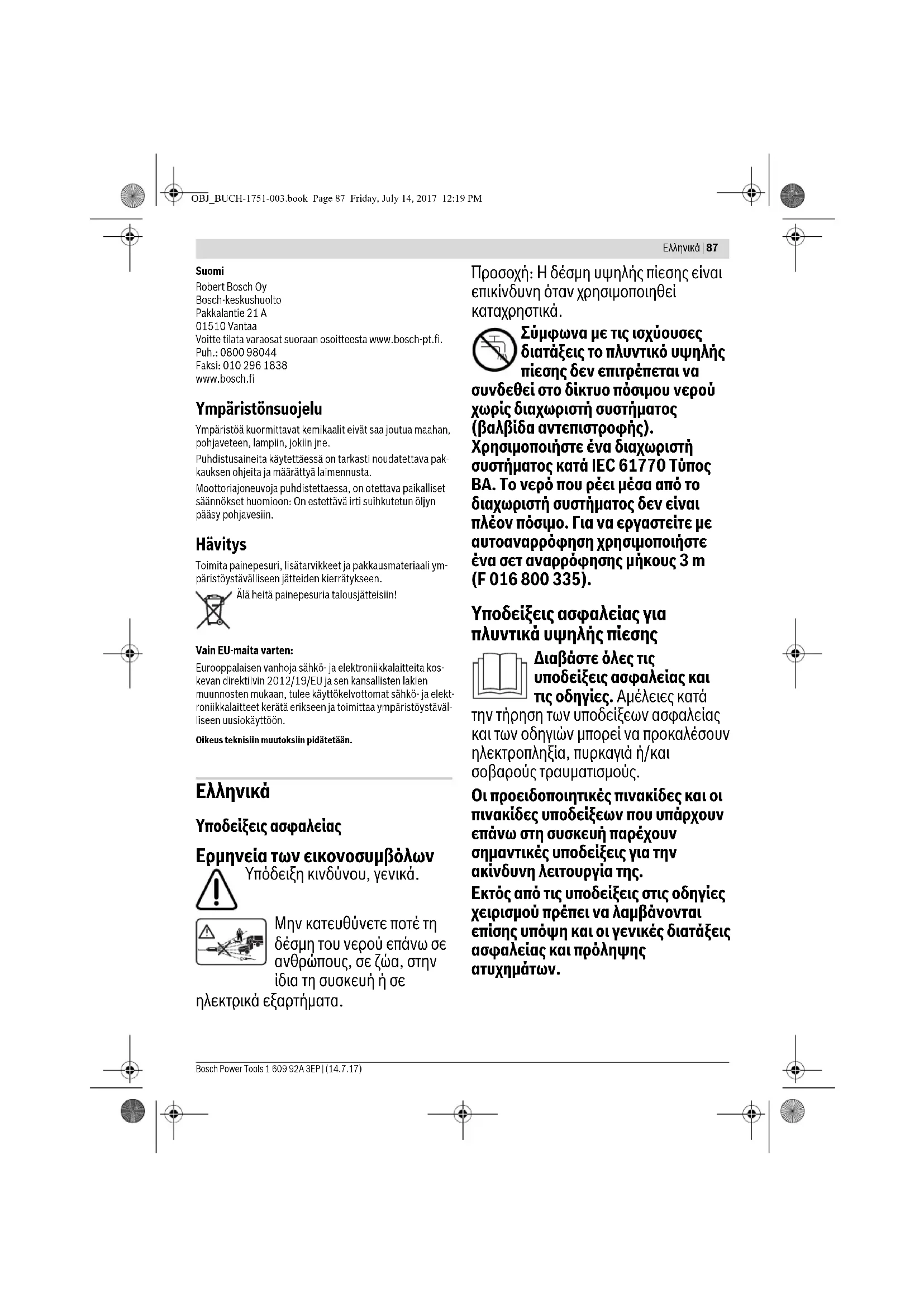 Υποδείξεις ασφαλείας Ερμηνεία των εικονοσυμβόλων Υπόδειξη κινδύνου, γενικά. Μην κατευθύνετε ποτέ τη δέσμη του νερού επάνω σε ανθρώπους, σε ζώα, στην ίδια τη συσκευή ή σε ηλεκτρικά εξαρτήματα. Προσοχή: Η δέσμη υψηλής πίεσης είναι επικίνδυνη όταν χρησιμοποιηθεί καταχρηστικά. Σύμφωνα με τις ισχύουσες διατάξεις το πλυντικό υψηλής πίεσης δεν επιτρέπεται να συνδεθεί στο δίκτυο πόσιμου νερού χωρίς διαχωριστή συστήματος (βαλβίδα αντεπιστροφής). Χρησιμοποιήστε ένα διαχωριστή συστήματος κατά IEC 61770 Τύπος BA. Το νερό που ρέει μέσα από το διαχωριστή συστήματος δεν είναι πλέον πόσιμο. Για να εργαστείτε με αυτοαναρρόφηση χρησιμοποιήστε ένα σετ αναρρόφησης μήκους 3 m (F 016 800 335). Υποδείξεις ασφαλείας για πλυντικά υψηλής πίεσης Διαβάστε όλες τις υποδείξεις ασφαλείας και τις οδηγίες. Αμέλειες κατά την τήρηση των υποδείξεων ασφαλείας και των οδηγιών μπορεί να προκαλέσουν ηλεκτροπληξία, πυρκαγιά ή/και σοβαρούς τραυματισμούς. Οι προειδοποιητικές πινακίδες και οι πινακίδες υποδείξεων που υπάρχουν επάνω στη συσκευή παρέχουν σημαντικές υποδείξεις για την ακίνδυνη λειτουργία της. Εκτός από τις υποδείξεις στις οδηγίες χειρισμού πρέπει να λαμβάνονται επίσης υπόψη και οι γενικές διατάξεις ασφαλείας και πρόληψης ατυχημάτων. OBJ_BUCH-1751-003.book Page 87 Friday, July 14, 2017 12:19 PM88 | Eλληνικά 1 609 92A 3EP | (14.7.17) Bosch Power Tools Σύνδεση στο δίκτυο Η τάση της πηγής ρεύματος πρέπει να εκπληρώνει τις απαιτήσεις που αναγράφονται στην πινακίδα κατασκευαστή του μηχανήματος