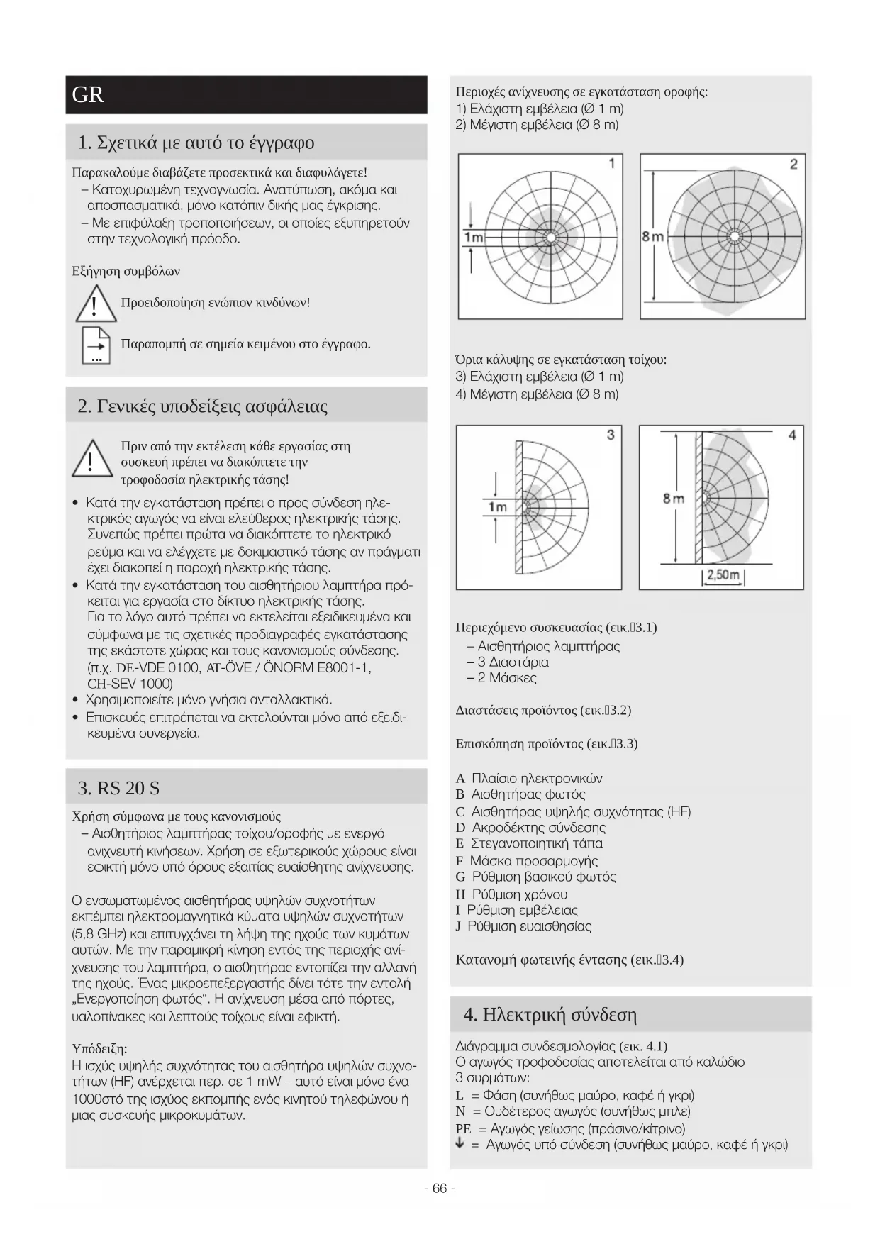 Χρήση σύμφωνα με τους κανονισμούς – Αισθητήριος λαμπτήρας τοίχου/οροφής με ενεργό ανιχνευτή κινήσεων. Χρήση σε εξωτερικούς χώρους είναι εφικτή μόνο υπό όρους εξαιτίας ευαίσθητης ανίχνευσης.Ο ενσωματωμένος αισθητήρας υψηλών συχνοτήτων εκπέμπει ηλεκτρομαγνητικά κύματα υψηλών συχνοτήτων (5,8GHz) και επιτυγχάνει τη λήψη της ηχούς των κυμάτων αυτών. Με την παραμικρή κίνηση εντός της περιοχής ανί-χνευσης του λαμπτήρα, ο αισθητήρας εντοπίζει την αλλαγή της ηχούς. Ένας μικροεπεξεργαστής δίνει τότε την εντολή „Ενεργοποίηση φωτός“. Η ανίχνευση μέσα από πόρτες, υαλοπίνακες και λεπτούς τοίχους είναι εφικτή.Υπόδειξη: H ισχύς υψηλής συχνότητας του αισθητήρα υψηλών συχνο-τήτων (HF) ανέρχεται περ. σε 1mW – αυτό είναι μόνο ένα 1000στό της ισχύος εκπομπής ενός κινητού τηλεφώνου ή μιας συσκευής μικροκυμάτων. !- 67 - Σε περίπτωση αμφιβολιών πρέπει να προβείτε σε αναγνώρι- ση των καλωδίων με δοκιμαστικό τάσης. Κατόπιν αποσυνδέ- ετε πάλι από την ηλεκτρική τάση. Φάση (L), ( ) και ουδέτε- ρος αγωγός (N) συνδέονται στον ακροδέκτη σύνδεσης.