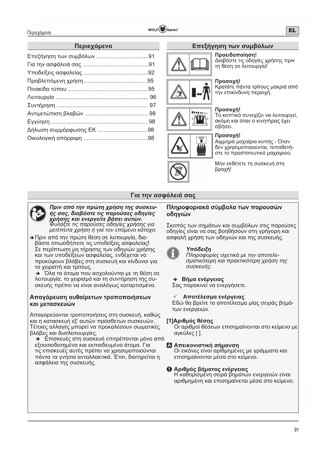 - Οικολογική απόρριψη Επεξήγηση των συμβόλων Προειδοποίηση! Διαβάστε τις οδηγίες χρήσης πριν τη θέση σε λειτουργία! p. 98