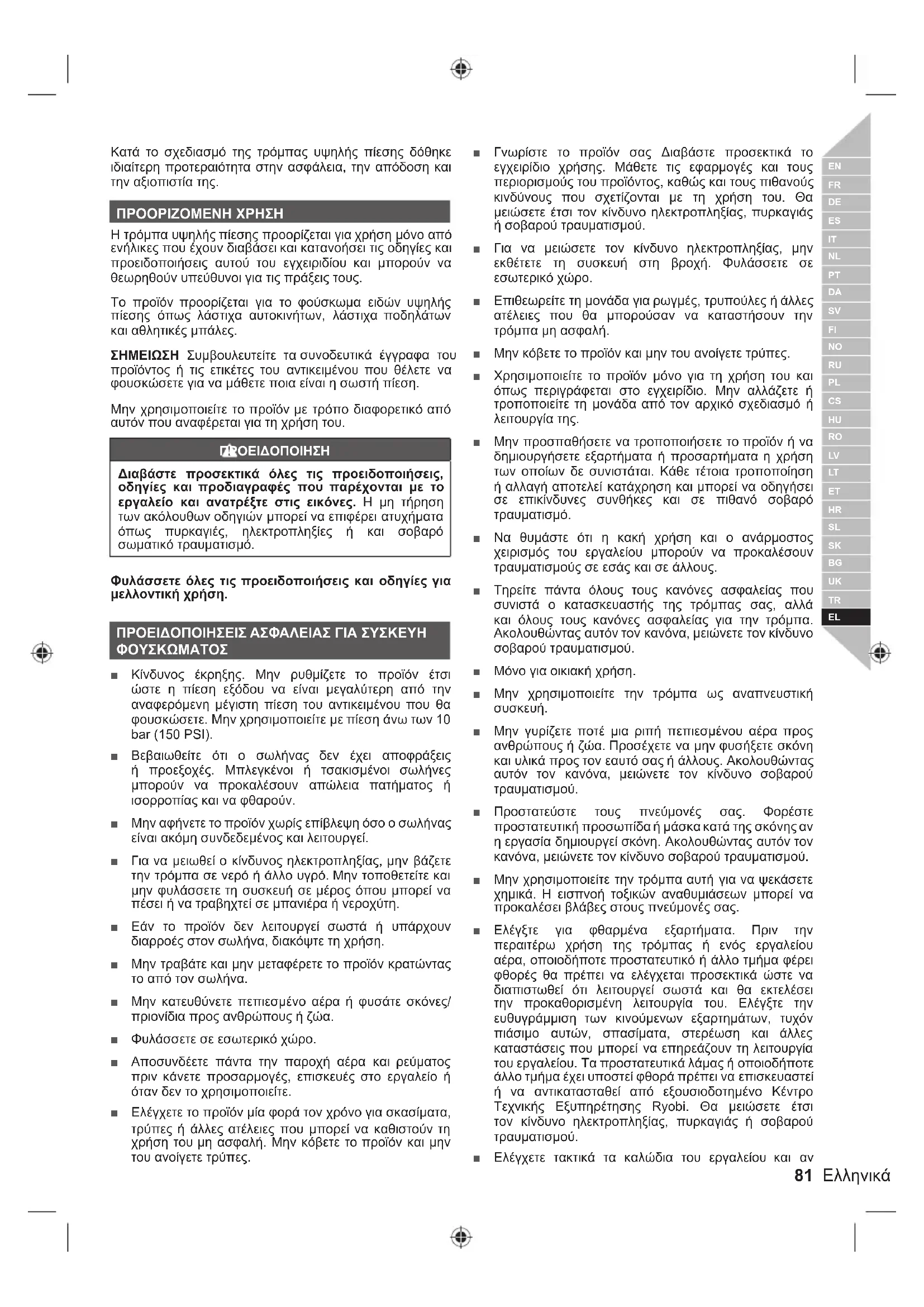 Κατά το σχεδιασμό της τρόμπας υψηλής πίεσης δόθηκε ιδιαίτερη προτεραιότητα στην ασφάλεια, την απόδοση και την αξιοπιστία της. ΠΡΟΟΡΙΖΟΜΕΝΗ ΧΡΗΣΗ Η τρόμπα υψηλής πίεσης προορίζεται για χρήση μόνο από ενήλικες που έχουν διαβάσει και κατανοήσει τις οδηγίες και προειδοποιήσεις αυτού του εγχειριδίου και μπορούν να θεωρηθούν υπεύθυνοι για τις πράξεις τους. Το προϊόν προορίζεται για το φούσκωμα ειδών υψηλής πίεσης όπως λάστιχα αυτοκινήτων, λάστιχα ποδηλάτων και αθλητικές μπάλες. ΣΗΜΕΙΩΣΗ Συμβουλευτείτε τα συνοδευτικά έγγραφα του προϊόντος ή τις ετικέτες του αντικειμένου που θέλετε να φουσκώσετε για να μάθετε ποια είναι η σωστή πίεση. Μην χρησιμοποιείτε το προϊόν με τρόπο διαφορετικό από αυτόν που αναφέρεται για τη χρήση του. ΠΡΟΕΙΔΟΠΟΙΗΣΗ Διαβάστε προσεκτικά όλες τις προειδοποιήσεις, οδηγίες και προδιαγραφές που παρέχονται με το εργαλείο και ανατρέξτε στις εικόνες. Η μη τήρηση των ακόλουθων οδηγιών μπορεί να επιφέρει ατυχήματα όπως πυρκαγιές, ηλεκτροπληξίες ή και σοβαρό σωματικό τραυματισμό. Φυλάσσετε όλες τις προειδοποιήσεις και οδηγίες για μελλοντική χρήση. ΠΡΟΕΙΔΟΠΟΙΗΣΕΙΣ ΑΣΦΑΛΕΙΑΣ ΓΙΑ ΣΥΣΚΕΥΗ ΦΟΥΣΚΩΜΑΤΟΣ ■ Κίνδυνος έκρηξης. Μην ρυθμίζετε το προϊόν έτσι ώστε η πίεση εξόδου να είναι μεγαλύτερη από την αναφερόμενη μέγιστη πίεση του αντικειμένου που θα φουσκώσετε. Μην χρησιμοποιείτε με πίεση άνω των 10 bar (150 PSI). ■ Βεβαιωθείτε ότι ο σωλήνας δεν έχει αποφράξεις ή προεξοχές. Μπλεγκένοι ή τσακισμένοι σωλήνες μπορούν να προκαλέσουν απώλεια πατήματος ή ισορροπίας και να φθαρούν. ■ Μην αφήνετε το προϊόν χωρίς επίβλεψη όσο ο σωλήνας είναι ακόμη συνδεδεμένος και λειτουργεί. ■ Για να μειωθεί ο κίνδυνος ηλεκτροπληξίας, μην βάζετε την τρόμπα σε νερό ή άλλο υγρό. Μην τοποθετείτε και μην φυλάσσετε τη συσκευή σε μέρος όπου μπορεί να πέσει ή να τραβηχτεί σε μπανιέρα ή νεροχύτη. ■ Εάν το προϊόν δεν λειτουργεί σωστά ή υπάρχουν διαρροές στον σωλήνα, διακόψτε τη χρήση. ■ Μην τραβάτε και μην μεταφέρετε το προϊόν κρατώντας το από τον σωλήνα. ■ Μην κατευθύνετε πεπιεσμένο αέρα ή φυσάτε σκόνες/ πριονίδια προς ανθρώπους ή ζώα. ■ Φυλάσσετε σε εσωτερικό χώρο. ■ Αποσυνδέετε πάντα την παροχή αέρα και ρεύματος πριν κάνετε προσαρμογές, επισκευές στο εργαλείο ή όταν δεν το χρησιμοποιείτε. ■ Ελέγχετε το προϊόν μία φορά τον χρόνο για σκασίματα, τρύπες ή άλλες ατέλειες που μπορεί να καθιστούν τη χρήση του μη ασφαλή. Μην κόβετε το προϊόν και μην του ανοίγετε τρύπες. ■ Γνωρίστε το προϊόν σας Διαβάστε προσεκτικά το εγχειρίδιο χρήσης. Μάθετε τις εφαρμογές και τους περιορισμούς του προϊόντος, καθώς και τους πιθανούς κινδύνους που σχετίζονται με τη χρήση του. Θα μειώσετε έτσι τον κίνδυνο ηλεκτροπληξίας, πυρκαγιάς ή σοβαρού τραυματισμού. ■ Για να μειώσετε τον κίνδυνο ηλεκτροπληξίας, μην εκθέτετε τη συσκευή στη βροχή. Φυλάσσετε σε εσωτερικό χώρο. ■ Επιθεωρείτε τη μονάδα για ρωγμές, τρυπούλες ή άλλες ατέλειες που θα μπορούσαν να καταστήσουν την τρόμπα μη ασφαλή. ■ Μην κόβετε το προϊόν και μην του ανοίγετε τρύπες. ■ Χρησιμοποιείτε το προϊόν μόνο για τη χρήση του και όπως περιγράφεται στο εγχειρίδιο. Μην αλλάζετε ή τροποποιείτε τη μονάδα από τον αρχικό σχεδιασμό ή λειτουργία της. ■ Μην προσπαθήσετε να τροποποιήσετε το προϊόν ή να δημιουργήσετε εξαρτήματα ή προσαρτήματα η χρήση των οποίων δε συνιστάται. Κάθε τέτοια τροποποίηση ή αλλαγή αποτελεί κατάχρηση και μπορ