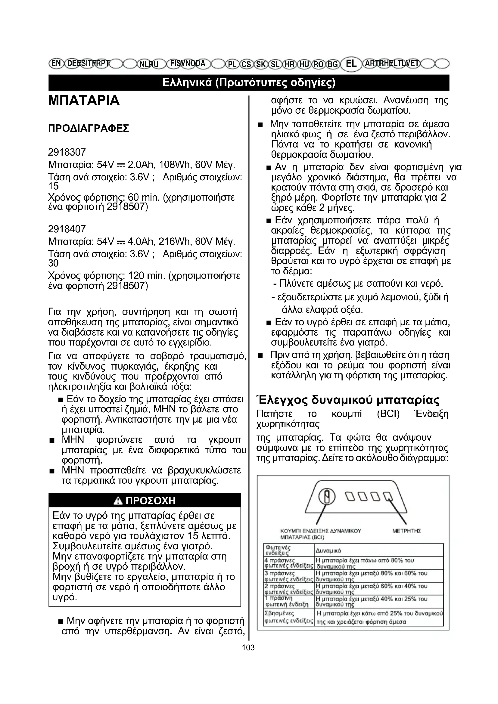Χρόνος φόρτισης: 120 min. (χρησιμοποιήστε ένα φορτιστή 2918507) Για την χρήση, συντήρηση και τη σωστή αποθήκευση της μπαταρίας, είναι σημαντικό να διαβάσετε και να κατανοήσετε τις οδηγίες που παρέχονται σε αυτό το εγχειρίδιο. Για να αποφύγετε το σοβαρό τραυματισμό, τον κίνδυνος πυρκαγιάς, έκρηξης και τους κινδύνους που προέρχονται από ηλεκτροπληξία και βολταϊκά τόξα: ■ Εάν το δοχείο της μπαταρίας έχει σπάσει ή έχει υποστεί ζημιά, ΜΗΝ το βάλετε στο φορτιστή. Αντικαταστήστε την με μια νέα