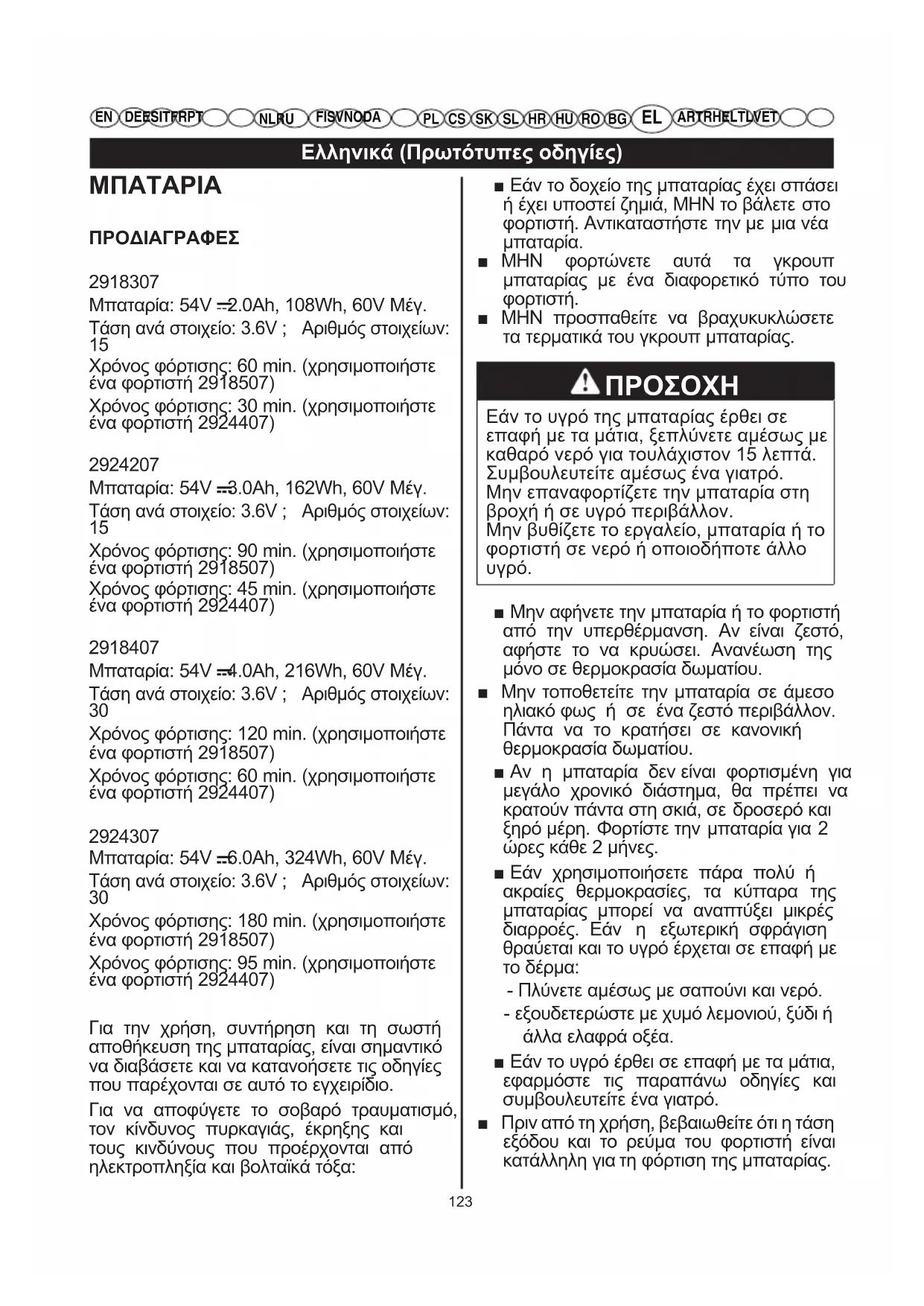 Χρόνος φόρτισης: 180 min. (χρησιμοποιήστε ένα φορτιστή 2918507) Χρόνος φόρτισης: 95 min. (χρησιμοποιήστε ένα φορτιστή 2924407) Για την χρήση, συντήρηση και τη σωστή αποθήκευση της μπαταρίας, είναι σημαντικό να διαβάσετε και να κατανοήσετε τις οδηγίες που παρέχονται σε αυτό το εγχειρίδιο. Για να αποφύγετε το σοβαρό τραυματισμό, τον κίνδυνος πυρκαγιάς, έκρηξης και τους κινδύνους που προέρχονται από ηλεκτροπληξία και βολταϊκά τόξα: ■ Εάν το δοχείο της μπαταρίας έχει σπάσει ή έχει υποστεί ζημιά, ΜΗΝ το βάλετε στο φορτιστή. Αντικαταστήστε την με μια νέα