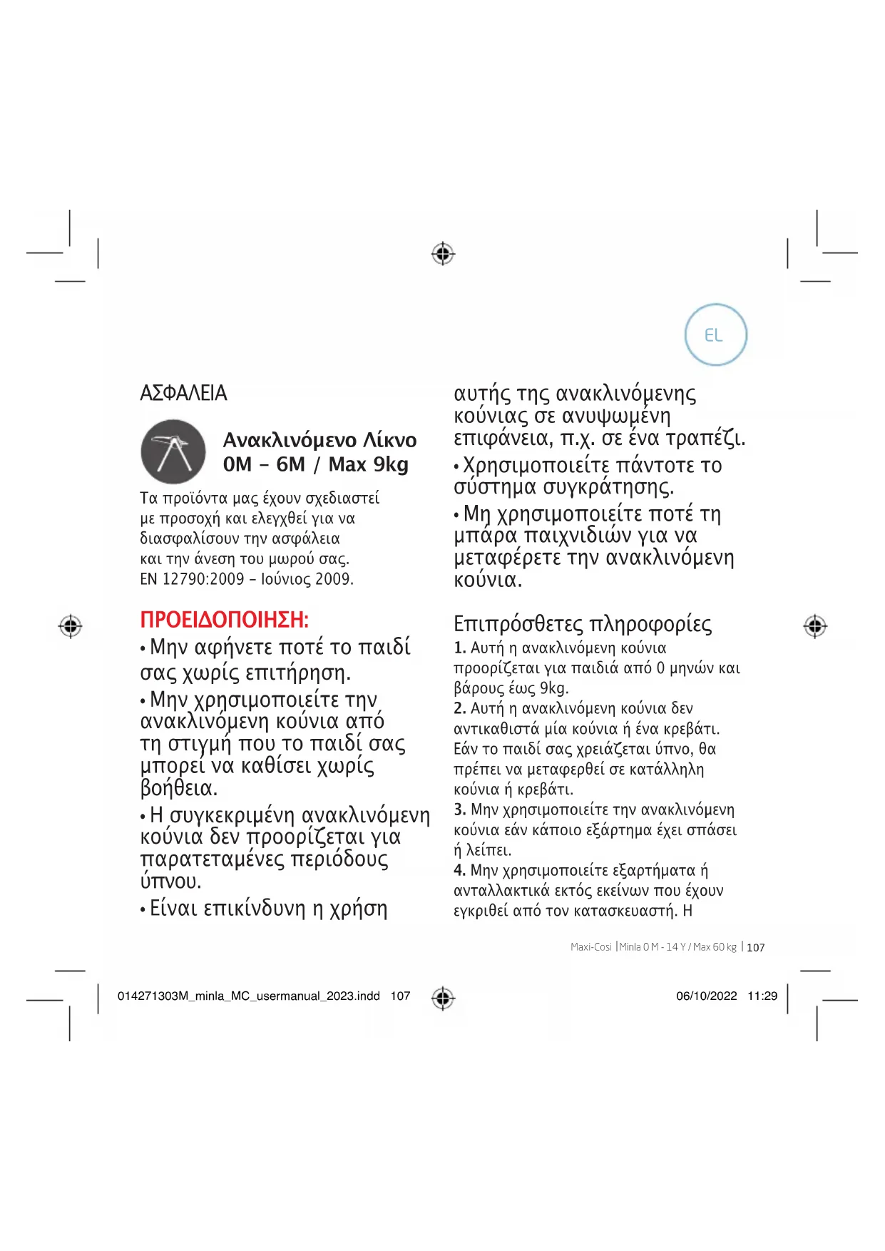 ανταλλακτικά εκτός εκείνων που έχουν εγκριθεί από τον κατασκευαστή. Η 014271303M_minla_MC_usermanual_2023.indd 107014271303M_minla_MC_usermanual_2023.indd 107 06/10/2022 11:2906/10/2022 11:29108 Minla 0 M - 14 Y / Max 60 kg