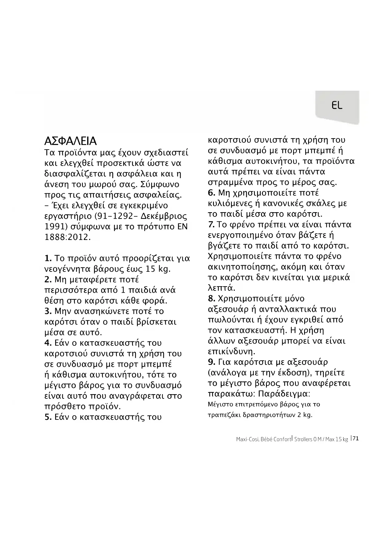 επιδείξετε την απόδειξη αγοράς η οποία πραγματοποιήθηκε στο διάστημα των τελευταίων 24 μηνών πριν από την αίτηση για τεχνική υποστήριξη. Για τη διευκόλυνσή σας μπορείτε να ζητήσετε από το τμήμα τεχνικής υποστήριξης της να προεγκρίνουμε εμείς την αίτησή σας για τεχνική υποστήριξη. Εάν υποβάλλετε έγκυρη αξίωση σύμφωνα με την παρούσα εγγύηση, ενδέχεται να ζητήσουμε επιστροφή του προϊόντος σε εξουσιοδοτημένο αντιπρόσωπο ή αναγνωρισμένο πωλητή λιανικής ή αποστολή του προϊόντος σε εμάς σύμφωνα με τις οδηγίες μας. Θα καλύψουμε τα έξοδα αποστολής και επιστροφής εάν τηρηθούν όλες οι οδηγίες. Βλάβες και/ή ελαττώματα που δεν καλύπτονται από την εγγύησή μας ή από τα νομικά δικαιώματα του καταναλωτή και βλάβες και/ή ελαττώματα που αφορούν τα προϊόντά μας που δεν καλύπτονται από την εγγύησή μας, μπορούν να επισκευαστούν σε λογικές τιμές. Δικαιώματα του καταναλωτή: Ο καταναλωτής έχει νόμιμα δικαιώματα σύμφωνα με την ισχύουσα νομοθεσία περί καταναλωτών, που είναι πιθανόν να διαφέρει σε κάθε χώρα. Τα δικαιώματα του καταναλωτή σύμφωνα με την ισχύουσα εθνική νομοθεσία δεν επηρεάζονται από την παρούσα εγγύηση. Εγγύηση εφόρου ζωής: Maxi-Cosi, Bébé Confort Σύμφωνα με τους όρους και τις προϋποθέσεις που δημοσιεύονται στην ιστοσελίδα μας, ο κατασκευαστής προσφέρει εθελοντική εγγύηση εφόρου ζωή για τους πρώτους χρήστες. Για την διεκδίκηση της εγγύησης εφόρου ζωής θα πρέπει να εγγραφείτε στην ιστοσελίδα μας: Maxi-Cosi: www.maxi-cosi.com/lifetimewarranty Bébé Confort: www.bebeconfort.com/lifetimewarranty78