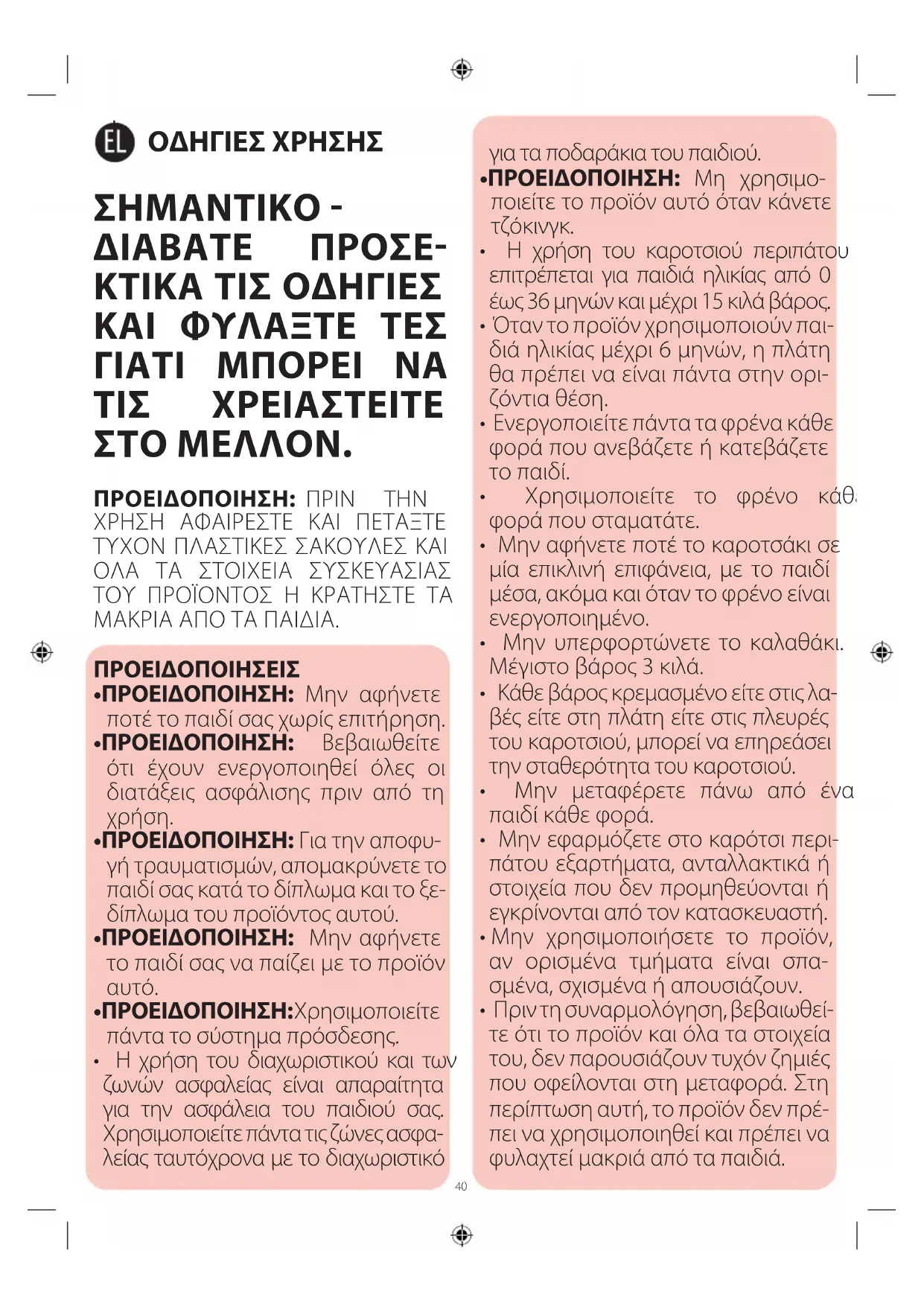 - Η χρήση του καροτσιού περιπάτου επιτρέπεται για παιδιά ηλικίας από 0 έως 36 μηνών και μέχρι 15 κιλά βάρος.