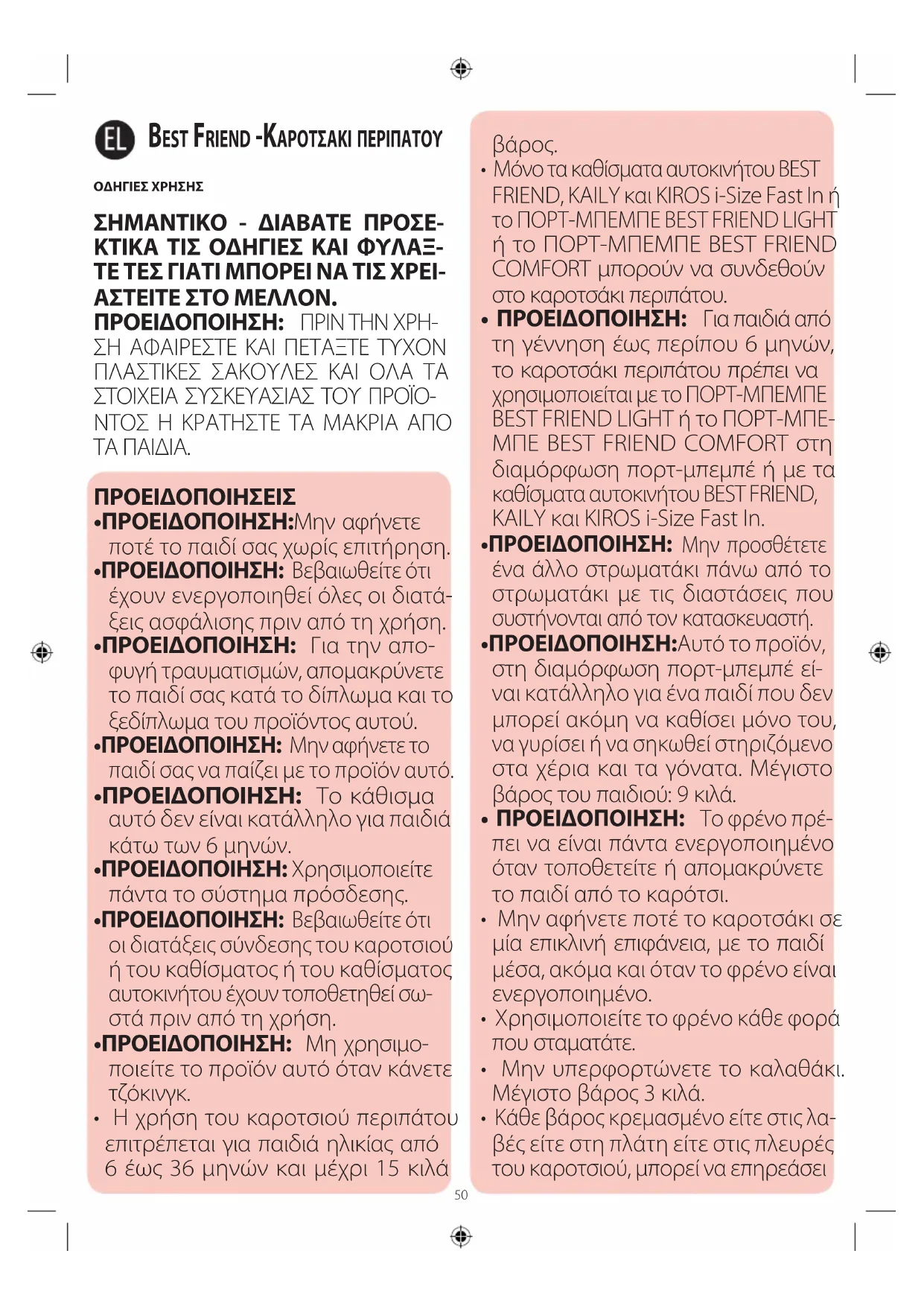 - ΠΡΟΕΙΔΟΠΟΙΗΣΗ: Για παιδιά από τη γέννηση έως περίπου 6 μηνών, το καροτσάκι περιπάτου πρέπει να χρησιμοποιείται με το ΠΟΡΤ-ΜΠΕΜΠΕ BEST FRIEND LIGHT ή το ΠΟΡΤ-ΜΠΕ- ΜΠΕ BEST FRIEND COMFORT στη διαμόρφωση πορτ-μπεμπέ ή με τα καθίσματα αυτοκινήτου BEST FRIEND, KAILY και KIROS i-Size Fast In.