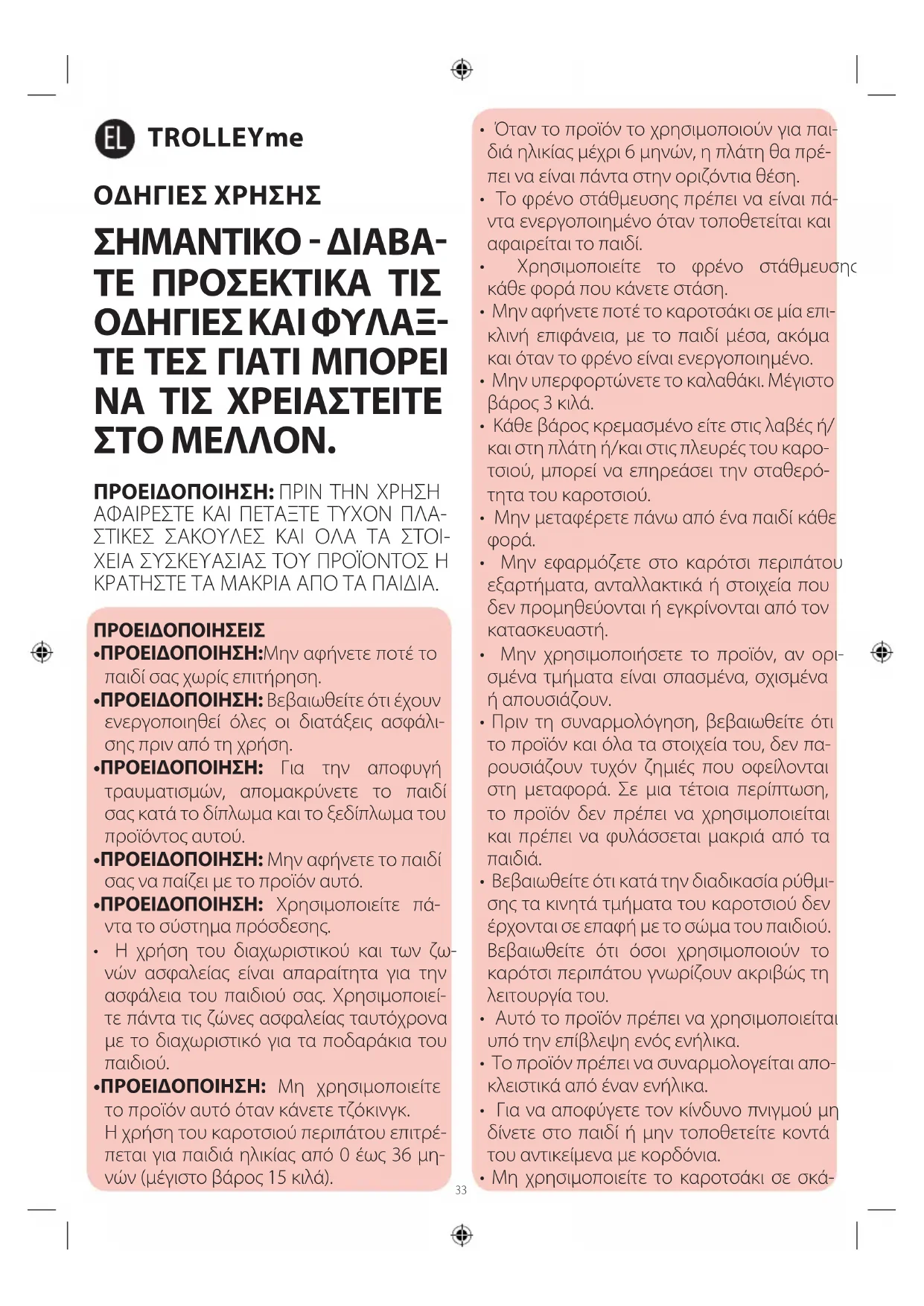 - Βεβαιωθείτε ότι κατά την διαδικασία ρύθμι- σης τα κινητά τμήματα του καροτσιού δεν έρχονται σε επαφή με το σώμα του παιδιού. Βεβαιωθείτε ότι όσοι χρησιμοποιούν το καρότσι περιπάτου γνωρίζουν ακριβώς τη λειτουργία του.