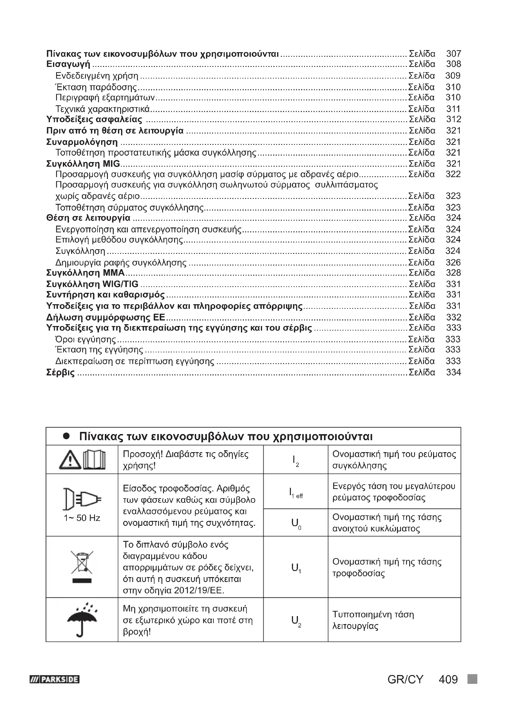 Τυποποιημένη τάση λειτουργίας Πίνακας των εικονοσυμβόλων που χρησιμοποιούνται .................................................. Σελίδα 307 Εισαγωγή ............................................................................................................................ Σελίδα 308 Ενδεδειγμένη χρήση ......................................................................................................... Σελίδα 309 Έκταση παράδοσης .......................................................................................................... Σελίδα 310 Περιγραφή εξαρτημάτων ...................................................................................................Σελίδα 310 Τεχνικά χαρακτηριστικά ..................................................................................................... Σελίδα 311 Υποδείξεις ασφαλείας ....................................................................................................... Σελίδα 312 Πριν από τη θέση σε λειτουργία ....................................................................................... Σελίδα 321 Συναρμολόγηση .................................................................................................................Σελίδα 321 Τοποθέτηση προστατευτικής μάσκα συγκόλλησης ........................................................... Σελίδα 321 Συγκόλληση MIG................................................................................................................. Σελίδα 321 Προσαρμογή συσκευής για συγκόλληση μασίφ σύρματος με αδρανές αέριο ................... Σελίδα 322 Προσαρμογή συσκευής για συγκόλληση σωληνωτού σύρματος συλλιπάσματος χωρίς αδρανές αέριο .........................................................................................................Σελίδα 323 Τοποθέτηση σύρματος συγκόλλησης................................................................................Σελίδα 323 Θέση σε λειτουργία ............................................................................................................ Σελίδα 324 Ενεργοποίηση και απενεργοποίηση συσκευής .................................................................Σελίδα 324 Επιλογή μεθόδου συγκόλλησης ........................................................................................ Σελίδα 324 Συγκόλληση ...................................................................................................................... Σελίδα 324 Δημιουργία ραφής συγκόλλησης ......................................................................................Σελίδα 326 Συγκόλληση MMA ...............................................................................................................Σελίδα 328 Συγκόλληση WIG/TIG ......................................................................................................... Σελίδα 331 Συντήρηση και καθαρισμός ...............................................................................................Σελίδα 331 Υποδείξεις για το περιβάλλον και πληροφορίες απόρριψης ......................................... Σελίδα 331 Δήλωση συμμόρφωσης ΕΕ ............................................................................................... Σελίδα 332 Υποδείξεις για τη διεκπεραίωση της εγγύησης και του σέρβις .....................................Σελίδα 333 Όροι εγγύησης .................................................................................................................. Σελίδα 333 Έκταση της εγγύησης ....................................................................................................... Σελίδα 333 Διεκπεραίωση σε περίπτωση εγγύησης ........................................................................... Σελίδα 333 Σέρβις ..................................................................................................................................Σελίδα 334410 GR/CY Η ηλεκτροπληξία από το ηλεκτρόδιο συγκόλλησης ενδέχεται να είναι θανατηφόρα!