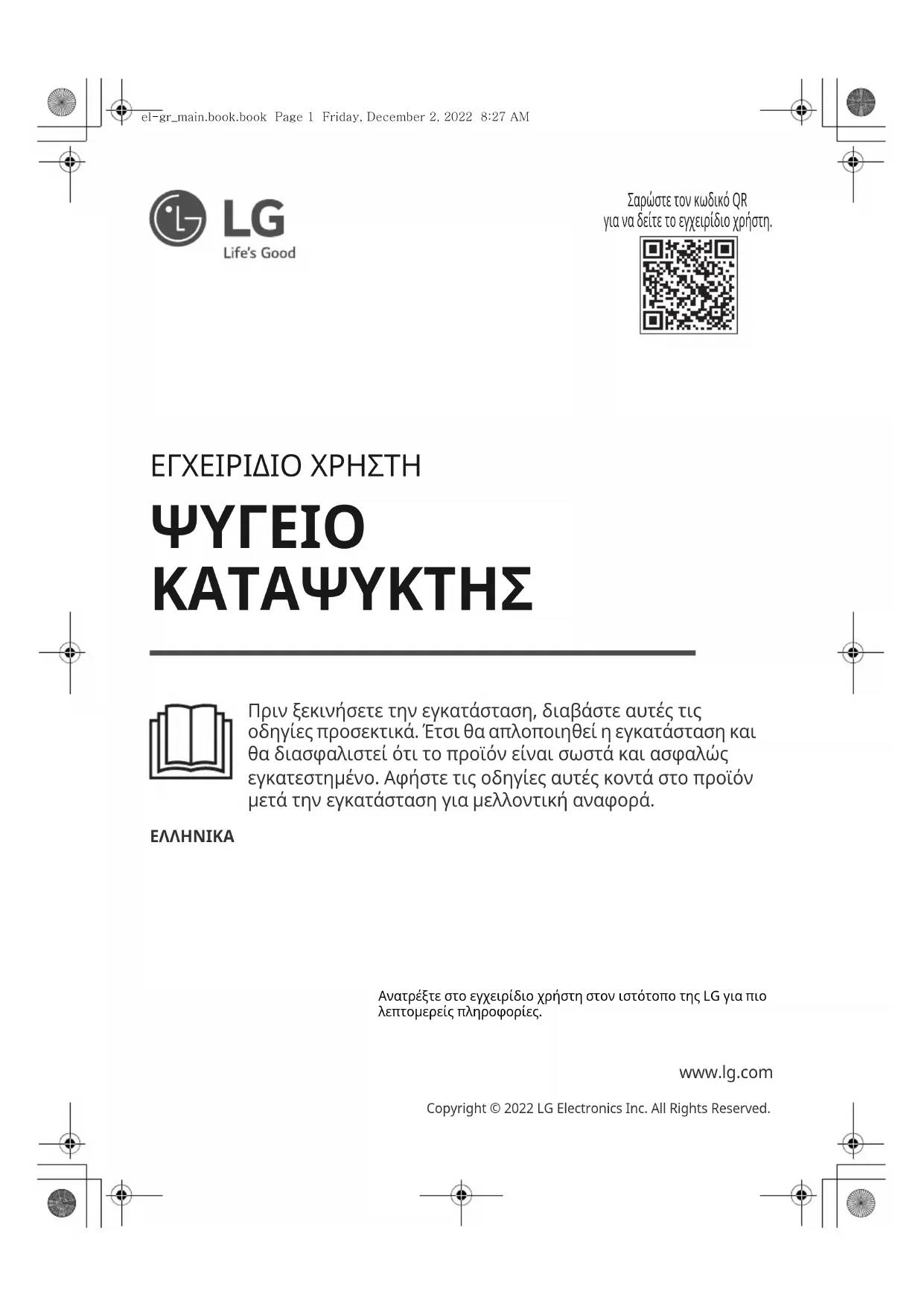 - www.lg.com Copyright © 2022 LG Electronics Inc. All Rights Reserved. Ανατρέξτε στο εγχειρίδιο χρήστη στον ιστότοπο της LG για πιο λεπτομερείς πληροφορίες. Σαρώστε τον κωδικό QR για να δείτε το εγχειρίδιο χρήστη. el-gr_main.book.book Page 1 Friday, December 2, 2022 8:27 AMΠΙΝΑΚΑΣ ΠΕΡΙΕΧΟΜΕΝΩΝ Το εγχειρίδιο αυτό μπορεί να περιέχει εικόνες ή περιεχόμενο διαφορετικό από το μοντέλο που αγοράσατε. Το εγχειρίδιο υπόκειται σε αναθεώρηση από τον κατασκευαστή. ΟΔΗΓΙΕΣ ΑΣΦΑΛΕΙΑΣ ΔΙΑΒΑΣΤΕ ΟΛΕΣ ΤΙΣ ΟΔΗΓΙΕΣ ΠΡΙΝ ΑΠΟ ΤΗ ΧΡΗΣΗ p. 3