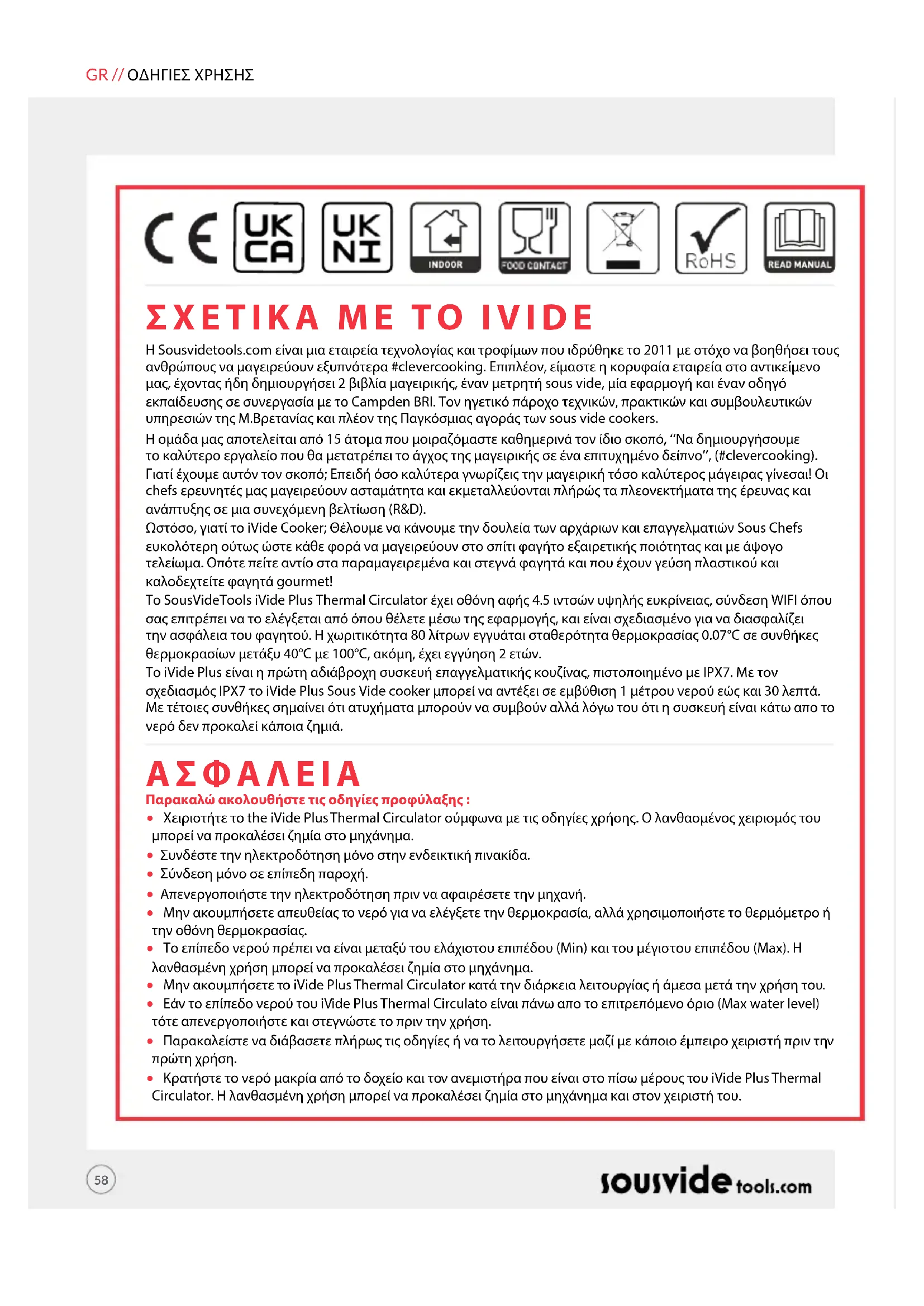 Η Sousvidetools.com είναι μια εταιρεία τεχνολογίας και τροφίμων που ιδρύθηκε το 2011 με στόχο να βοηθήσει τους ανθρώπους να μαγειρεύουν εξυπνότερα #clevercooking. Επιπλέον, είμαστε η κορυφαία εταιρεία στο αντικείμενο μας, έχοντας ήδη δημιουργήσει 2 βιβλία μαγειρικής, έναν μετρητή sous vide, μία εφαρμογή και έναν οδηγό εκπαίδευσης σε συνεργασία με το Campden BRI. Τον ηγετικό πάροχο τεχνικών, πρακτικών και συμβουλευτικών υπηρεσιών της Μ.Βρετανίας και πλέον της Παγκόσμιας αγοράς των sous vide cookers. H ομάδα μας αποτελείται από 15 άτομα που μοιραζόμαστε καθημερινά τον ίδιο σκοπό, ‘‘Να δημιουργήσουμε το καλύτερο εργαλείο που θα μετατρέπει το άγχος της μαγειρικής σε ένα επιτυχημένο δείπνο’’, (#clevercooking). Γιατί έχουμε αυτόν τον σκοπό; Επειδή όσο καλύτερα γνωρίζεις την μαγειρική τόσο καλύτερος μάγειρας γίνεσαι! Οι chefs ερευνητές μας μαγειρεύουν ασταμάτητα και εκμεταλλεύονται πλήρώς τα πλεονεκτήματα της έρευνας και ανάπτυξης σε μια συνεχόμενη βελτίωση (R&D). Ωστόσο, γιατί το iVide Cooker; Θέλουμε να κάνουμε την δουλεία των αρχάριων και επαγγελματιών Sous Chefs ευκολότερη ούτως ώστε κάθε φορά να μαγειρεύουν στο σπίτι φαγήτο εξαιρετικής ποιότητας και με άψογο τελείωμα. Οπότε πείτε αντίο στα παραμαγειρεμένα και στεγνά φαγητά και που έχουν γεύση πλαστικού και καλοδεχτείτε φαγητά gourmet! Το SousVideTools iVide Plus Thermal Circulator έχει οθόνη αφής 4.5 ιντσών υψηλής ευκρίνειας, σύνδεση WIFI όπου σας επιτρέπει να το ελέγξεται από όπου θέλετε μέσω της εφαρμογής, και είναι σχεδιασμένο για να διασφαλίζει την ασφάλεια του φαγητού. Η χωριτικότητα 80 λίτρων εγγυάται σταθερότητα θερμοκρασίας 0.07°C σε συνθήκες θερμοκρασίων μετάξυ 40°C με 100°C, ακόμη, έχει εγγύηση 2 ετών. Το iVide Plus είναι η πρώτη αδιάβροχη συσκευή επαγγελματικής κουζίνας, πιστοποιημένο με IPX7. Με τον σχεδιασμός IPX7 το iVide Plus Sous Vide cooker μπορεί να αντέξει σε εμβύθιση 1 μέτρου νερού εώς και 30 λεπτά. Με τέτοιες συνθήκες σημαίνει ότι ατυχήματα μπορούν να συμβούν αλλά λόγω του ότι η συσκευή είναι κάτω απο το νερό δεν προκαλεί κάποια ζημιά. Παρακαλώ ακολουθήστε τις οδηγίες προφύλαξης :