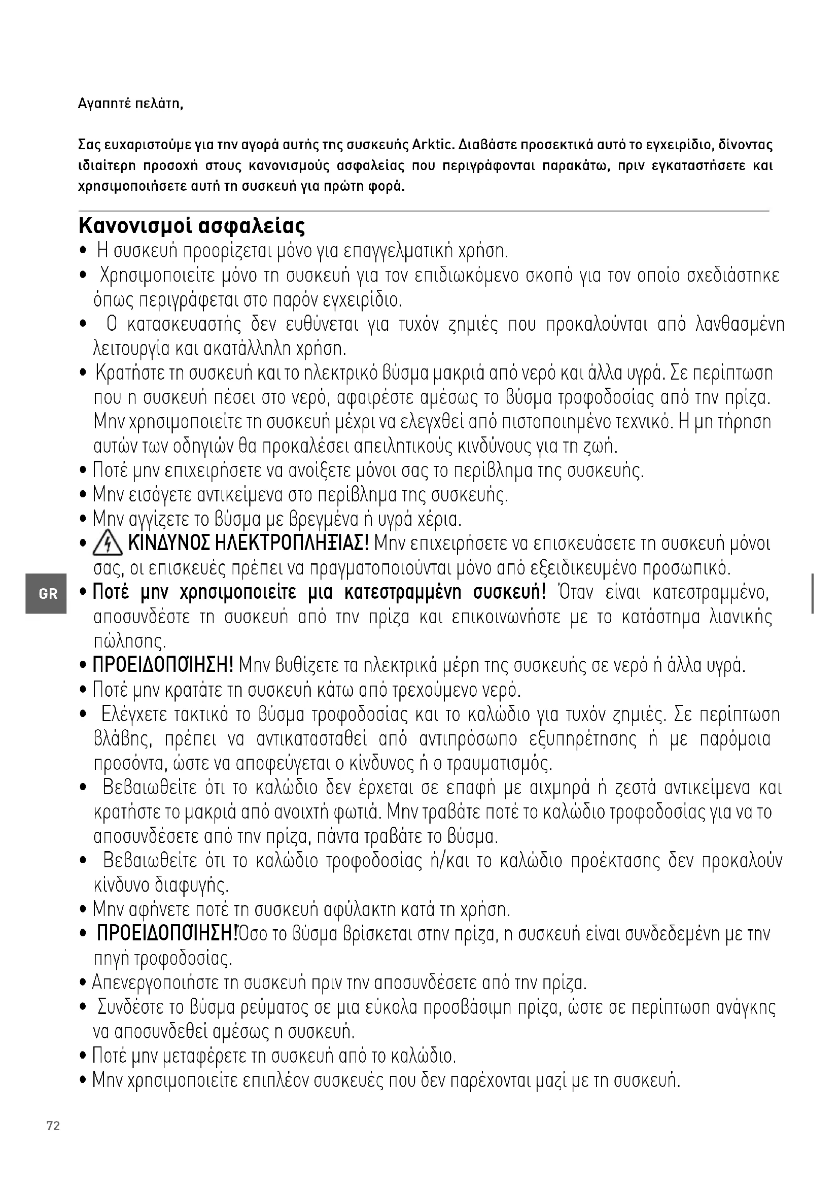 Αγαπητέ πελάτη, Σας ευχαριστούμε για την αγορά αυτής της συσκευής Arktic. Διαβάστε προσεκτικά αυτό το εγχειρίδιο, δίνοντας ιδιαίτερη προσοχή στους κανονισμούς ασφαλείας που περιγράφονται παρακάτω, πριν εγκαταστήσετε και χρησιμοποιήσετε αυτή τη συσκευή για πρώτη φορά. Κανονισμοί ασφαλείας