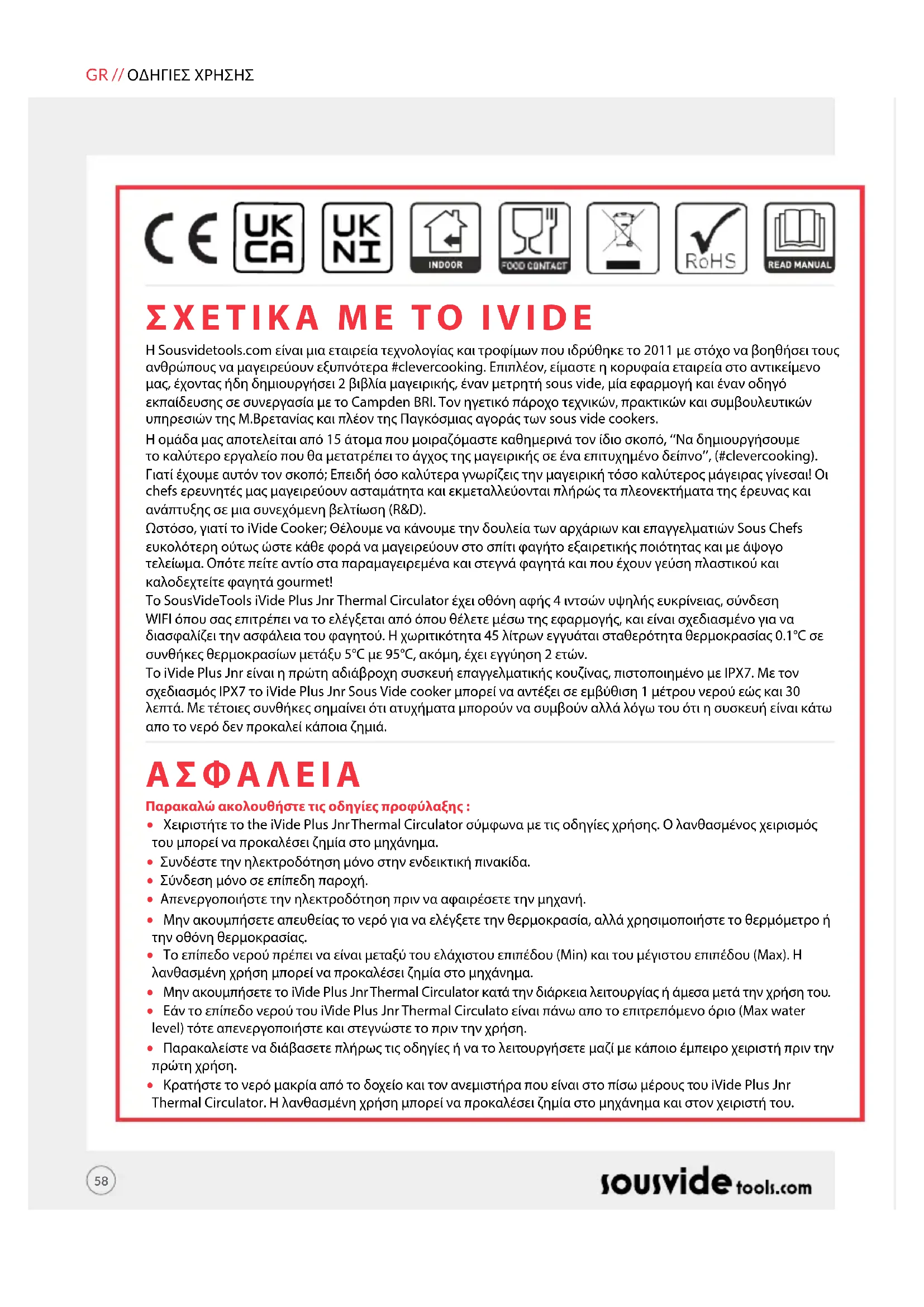 Η Sousvidetools.com είναι μια εταιρεία τεχνολογίας και τροφίμων που ιδρύθηκε το 2011 με στόχο να βοηθήσει τους ανθρώπους να μαγειρεύουν εξυπνότερα #clevercooking. Επιπλέον, είμαστε η κορυφαία εταιρεία στο αντικείμενο μας, έχοντας ήδη δημιουργήσει 2 βιβλία μαγειρικής, έναν μετρητή sous vide, μία εφαρμογή και έναν οδηγό εκπαίδευσης σε συνεργασία με το Campden BRI. Τον ηγετικό πάροχο τεχνικών, πρακτικών και συμβουλευτικών υπηρεσιών της Μ.Βρετανίας και πλέον της Παγκόσμιας αγοράς των sous vide cookers. H ομάδα μας αποτελείται από 15 άτομα που μοιραζόμαστε καθημερινά τον ίδιο σκοπό, ‘‘Να δημιουργήσουμε το καλύτερο εργαλείο που θα μετατρέπει το άγχος της μαγειρικής σε ένα επιτυχημένο δείπνο’’, (#clevercooking). Γιατί έχουμε αυτόν τον σκοπό; Επειδή όσο καλύτερα γνωρίζεις την μαγειρική τόσο καλύτερος μάγειρας γίνεσαι! Οι chefs ερευνητές μας μαγειρεύουν ασταμάτητα και εκμεταλλεύονται πλήρώς τα πλεονεκτήματα της έρευνας και ανάπτυξης σε μια συνεχόμενη βελτίωση (R&D). Ωστόσο, γιατί το iVide Cooker; Θέλουμε να κάνουμε την δουλεία των αρχάριων και επαγγελματιών Sous Chefs ευκολότερη ούτως ώστε κάθε φορά να μαγειρεύουν στο σπίτι φαγήτο εξαιρετικής ποιότητας και με άψογο τελείωμα. Οπότε πείτε αντίο στα παραμαγειρεμένα και στεγνά φαγητά και που έχουν γεύση πλαστικού και καλοδεχτείτε φαγητά gourmet! Το SousVideTools iVide Plus Jnr Thermal Circulator έχει οθόνη αφής 4 ιντσών υψηλής ευκρίνειας, σύνδεση WIFI όπου σας επιτρέπει να το ελέγξεται από όπου θέλετε μέσω της εφαρμογής, και είναι σχεδιασμένο για να διασφαλίζει την ασφάλεια του φαγητού. Η χωριτικότητα 45 λίτρων εγγυάται σταθερότητα θερμοκρασίας 0.1°C σε συνθήκες θερμοκρασίων μετάξυ 5°C με 95°C, ακόμη, έχει εγγύηση 2 ετών. Το iVide Plus Jnr είναι η πρώτη αδιάβροχη συσκευή επαγγελματικής κουζίνας, πιστοποιημένο με IPX7. Με τον σχεδιασμός IPX7 το iVide Plus Jnr Sous Vide cooker μπορεί να αντέξει σε εμβύθιση 1 μέτρου νερού εώς και 30 λεπτά. Με τέτοιες συνθήκες σημαίνει ότι ατυχήματα μπορούν να συμβούν αλλά λόγω του ότι η συσκευή είναι κάτω απο το νερό δεν προκαλεί κάποια ζημιά. Παρακαλώ ακολουθήστε τις οδηγίες προφύλαξης :
