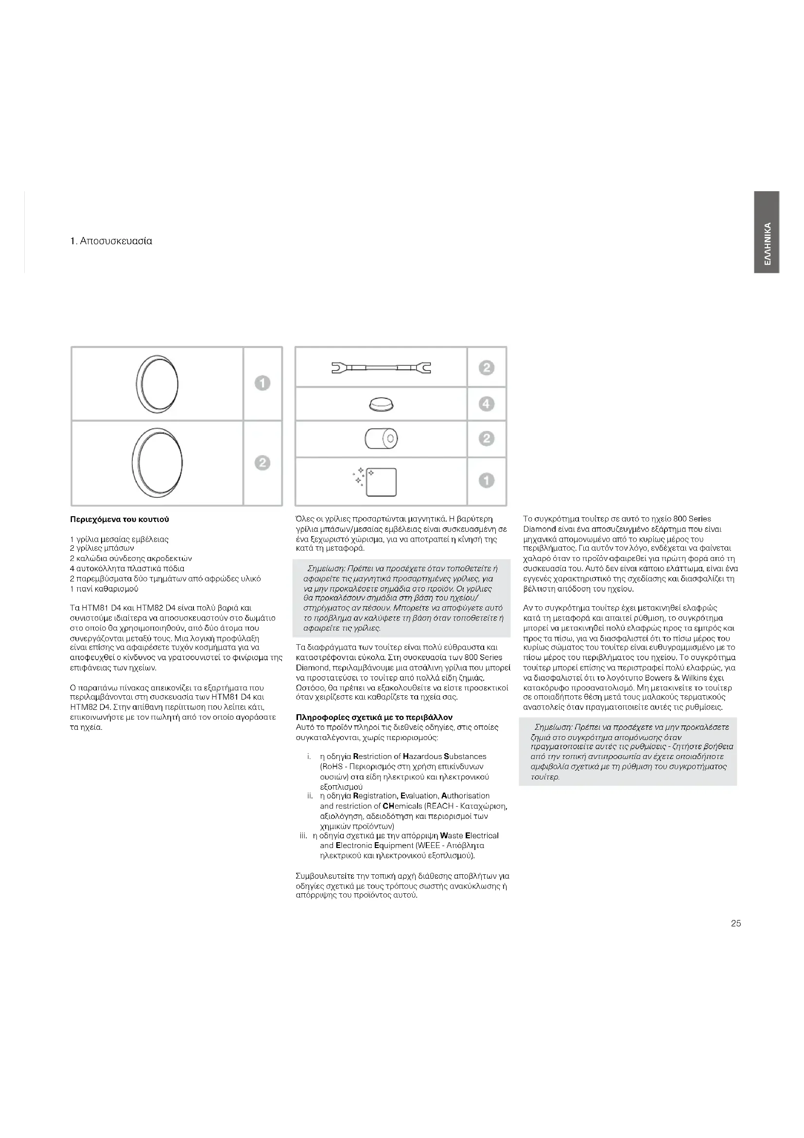 Όλες οι γρίλιες προσαρτώνται μαγνητικά. Η βαρύτερη γρίλια μπάσων/μεσαίας εμβέλειας είναι συσκευασμένη σε ένα ξεχωριστό χώρισμα, για να αποτραπεί η κίνησή της κατά τη μεταφορά. Σημείωση:Πρέπειναπροσέχετεόταντοποθετείτεή αφαιρείτετιςμαγνητικάπροσαρτημένεςγρίλιες,για ναμηνπροκαλέσετεσημάδιαστοπροϊόν.Οιγρίλιες θαπροκαλέσουνσημάδιαστηβάσητουηχείου/ στηρίγματοςανπέσουν.Μπορείτενααποφύγετεαυτό τοπρόβλημαανκαλύψετετηβάσηόταντοποθετείτεή αφαιρείτετιςγρίλιες. Τα διαφράγματα των τουίτερ είναι πολύ εύθραυστα και καταστρέφονται εύκολα. Στη συσκευασία των 800 Series Diamond, περιλαμβάνουμε μια ατσάλινη γρίλια που μπορεί να προστατεύσει το τουίτερ από πολλά είδη ζημιάς. Ωστόσο, θα πρέπει να εξακολουθείτε να είστε προσεκτικοί όταν χειρίζεστε και καθαρίζετε τα ηχεία σας. Πληροφορίες σχετικά με το περιβάλλον Αυτό το προϊόν πληροί τις διεθνείς οδηγίες, στις οποίες συγκαταλέγονται, χωρίς περιορισμούς: