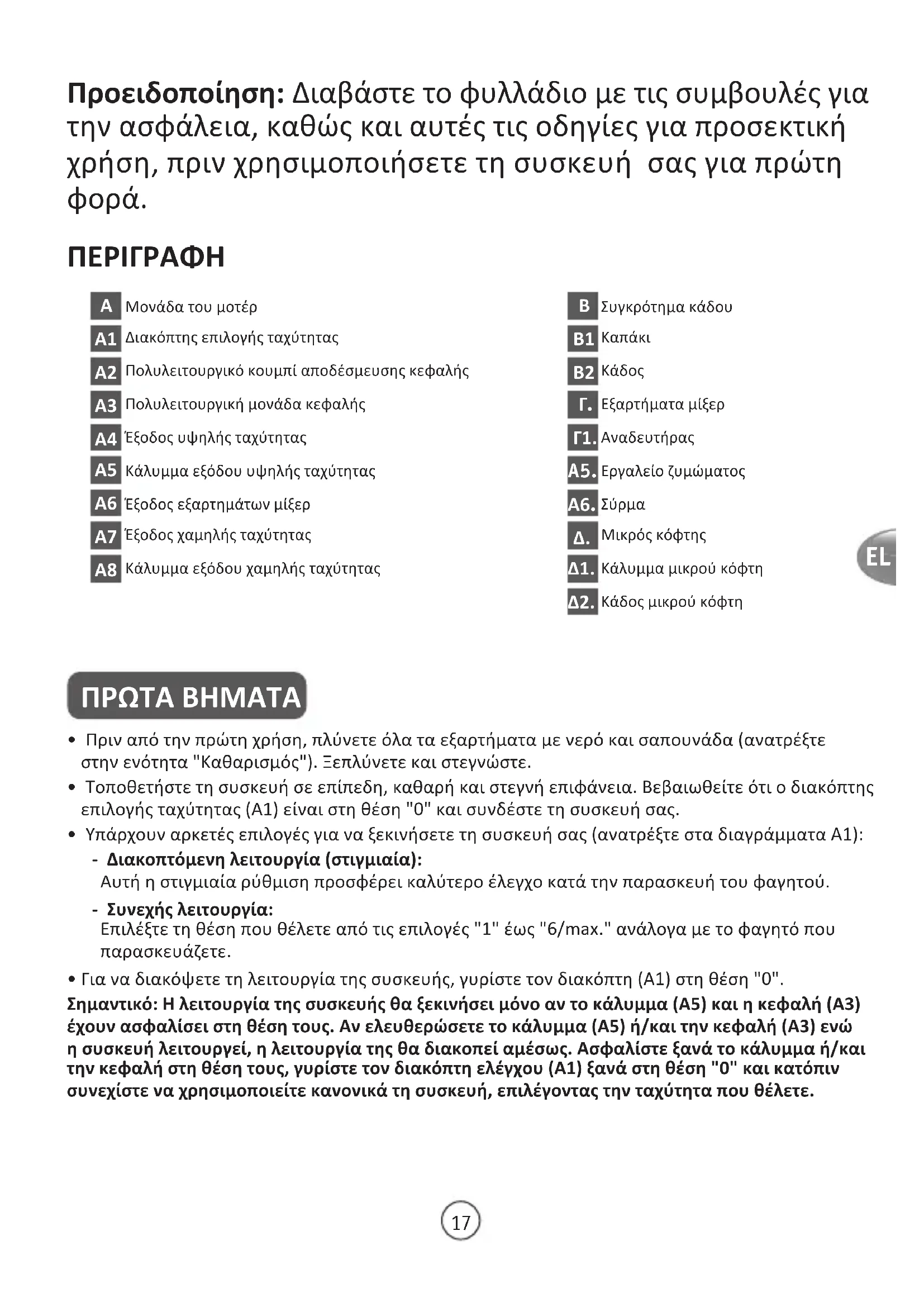 - Πριν από την πρώτη χρήση, πλύνετε όλα τα εξαρτήματα με νερό και σαπουνάδα (ανατρέξτε στην ενότητα "Καθαρισμός"). Ξεπλύνετε και στεγνώστε. • Τοποθετήστε τη συσκευή σε επίπεδη, καθαρή και στεγνή επιφάνεια. Βεβαιωθείτε ότι ο διακόπτης επιλογής ταχύτητας (A1) είναι στη θέση "0" και συνδέστε τη συσκευή σας. • Υπάρχουν αρκετές επιλογές για να ξεκινήσετε τη συσκευή σας (ανατρέξτε στα διαγράμματα A1): - Διακοπτόμενη λειτουργία (στιγμιαία): Αυτή η στιγμιαία ρύθμιση προσφέρει καλύτερο έλεγχο κατά την παρασκευή του φαγητού.- Συνεχής λειτουργία: Επιλέξτε τη θέση που θέλετε από τις επιλογές "1" έως "6/max." ανάλογα με το φαγητό που παρασκευάζετε. • Για να διακόψετε τη λειτουργία της συσκευής, γυρίστε τον διακόπτη (A1) στη θέση "0". Σημαντικό: Η λειτουργία της συσκευής θα ξεκινήσει μόνο αν το κάλυμμα (A5) και η κεφαλή (A3) έχουν ασφαλίσει στη θέση τους. Αν ελευθερώσετε το κάλυμμα (A5) ή/και την κεφαλή (A3) ενώ η συσκευή λειτουργεί, η λειτουργία της θα διακοπεί αμέσως. Ασφαλίστε ξανά το κάλυμμα ή/και την κεφαλή στη θέση τους, γυρίστε τον διακόπτη ελέγχου (A1) ξανά στη θέση "0" και κατόπιν συνεχίστε να χρησιμοποιείτε κανονικά τη συσκευή, επιλέγοντας την ταχύτητα που θέλετε.1918 ELEL
