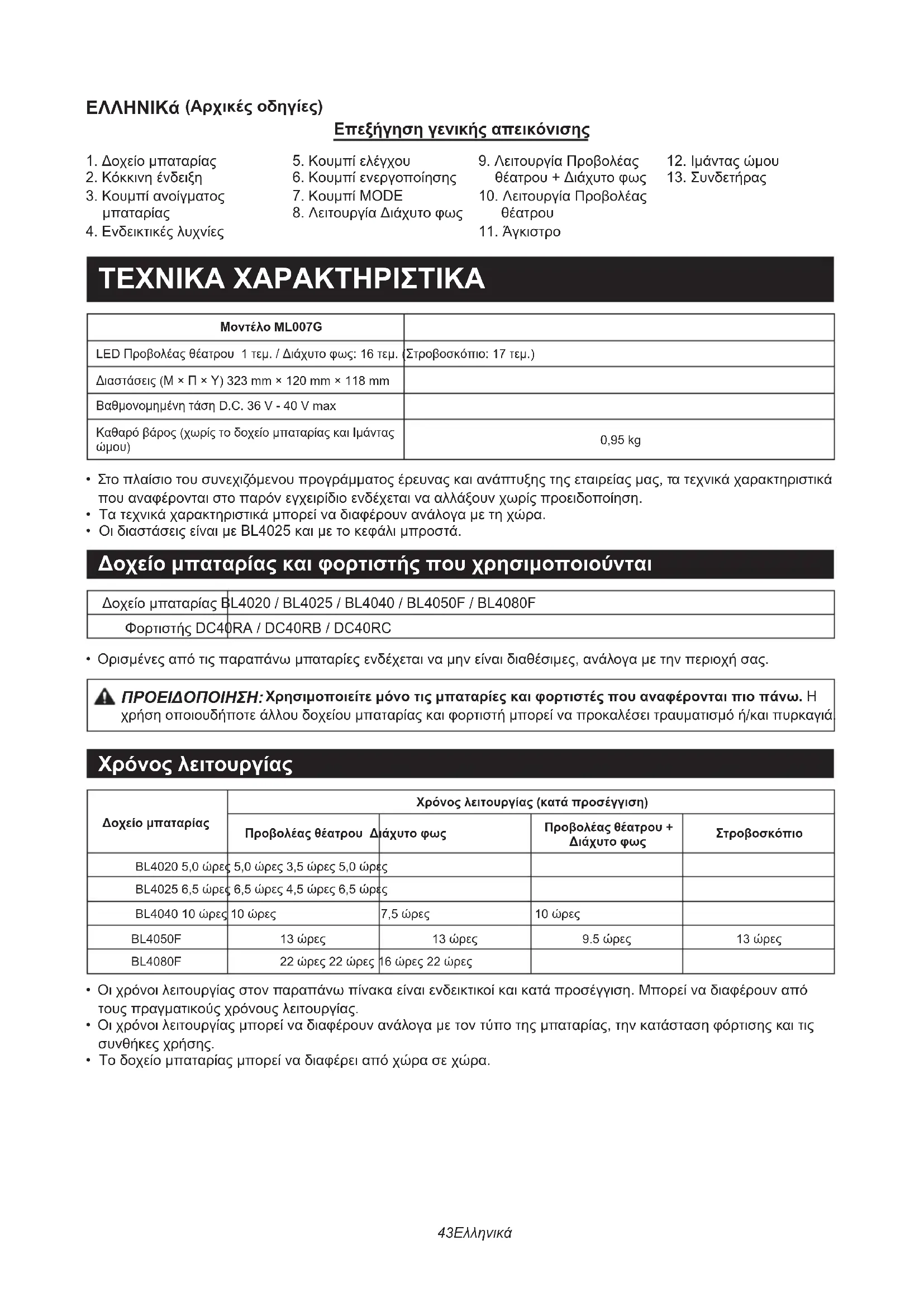 - Ορισμένες από τις παραπάνω μπαταρίες ενδέχεται να μην είναι διαθέσιμες, ανάλογα με την περιοχή σας. ΠΡΟΕΙΔΟΠΟΙΗΣΗ: Χρησιμοποιείτε μόνο τις μπαταρίες και φορτιστές που αναφέρονται πιο πάνω. Η χρήση οποιουδήποτε άλλου δοχείου μπαταρίας και φορτιστή μπορεί να προκαλέσει τραυματισμό ή/και πυρκαγιά. Χρόνος λειτουργίας Δοχείο μπαταρίαςΧρόνος λειτουργίας (κατά προσέγγιση)Προβολέας θέατρου Διάχυτο φωςΠροβολέας θέατρου + Διάχυτο φωςΣτροβοσκόπιοBL4020 5,0 ώρες 5,0 ώρες 3,5 ώρες 5,0 ώρεςBL4025 6,5 ώρες 6,5 ώρες 4,5 ώρες 6,5 ώρεςBL4040 10 ώρες 10 ώρες 7,5 ώρες 10 ώρες BL4050F 13 ώρες 13 ώρες 9.5 ώρες 13 ώρες BL4080F 22 ώρες 22 ώρες 16 ώρες 22 ώρες