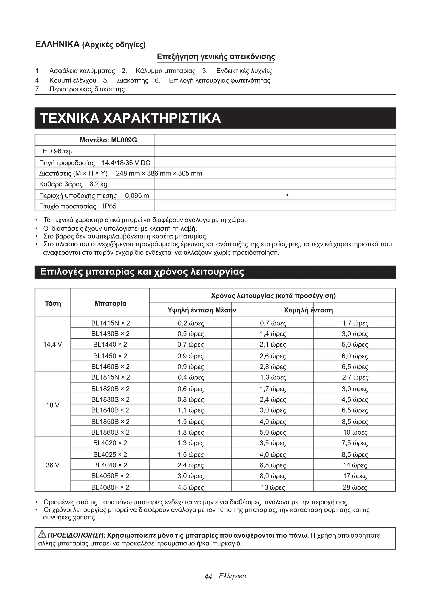 ΤΕΧΝΙΚΑ ΧΑΡΑΚΤΗΡΙΣΤΙΚΑ Μοντέλο: ML009G LED 96τεμ Πηγήτροφοδοσίας 14,4/18/36 V DC Διαστάσεις(Μ×Π×Υ) 248 mm × 386 mm × 305 mm Καθαρόβάρος 6,2 kg Περιοχήυποδοχήςπίεσης 0,095 m