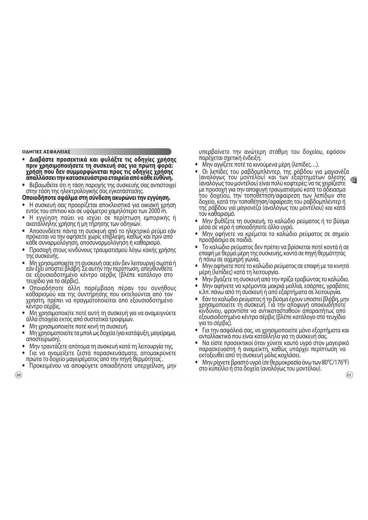 - Διαβάστε προσεκτικά και φυλάξτε τις οδηγίες χρήσης πριν χρησιμοποιήσετε τη συσκευή σας για πρώτη φορά: χρήση που δεν συμμορφώνεται προς τις οδηγίες χρήσης απαλλάσσει την κατασκευάστρια εταιρεία από κάθε ευθύνη.
