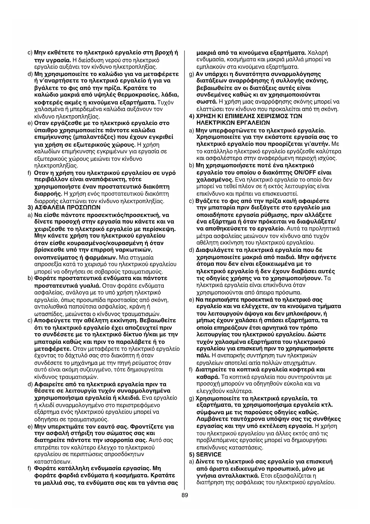 ΠΡΟEΙΔΟΠΟΙΗΣΗ!Διαβάστεόλεςτις προειδοποιητικέςυποδείξεις. Αμέλειες κατά την τήρηση των προειδοποιητικών υποδείξεων μπορεί να προκαλέσουν ηλεκτροπληξία, κίνδυνο πυρκαγιάς ή/και σοβαρούς τραυματισμούς. Φυλάξτεόλεςτις προειδοποιητικέςυποδείξειςκαιοδηγίεςγιακάθε μελλοντικήχρήση. Ο ορισμός “ηλεκτρικό εργαλείο” που χρησιμοποιείται στις προειδοποιητικές υποδείξεις αναφέρεται σε ηλεκτρικά εργαλεία που τροφοδοτούνται από το ηλεκτρικό δίκτυο (με ηλεκτρικό καλώδιο) καθώς και σε ηλεκτρικά εργαλεία που τροφοδοτούνται από μπαταρία (χωρίς ηλεκτρικό καλώδιο). 1)ΑΣΦΑΛΕΙΑΣΤΟXΩΡΟΕΡΓΑΣΊΑΣ a) Διατηρείτετοχώροπουεργάζεσθεκαθαρόκαι καλάφωτισμένο. Αταξία στο χώρο που εργάζεσθε ή μη φωτισμένες περιοχές εργασίας μπορεί να οδηγήσουν σε ατυχήματα. b) Μηνεργάζεσθεμετοηλεκτρικόεργαλείοσε περιβάλλονπουυπάρχεικίνδυνοςέκρηξης,στο οποίουπάρχουνεύφλεκταυγρά,αέριαήσκόνη. Τα ηλεκτρικά εργαλεία μπορεί να δημιουργήσουν σπινθηρισμό ο οποίος μπορεί να αναφλέξει τη σκόνη ή τις αναθυμιάσεις. c) Οτανχρησιμοποιείτετοηλεκτρικόεργαλείο κρατάτεταπαιδιάκιάλλατυχόνπρόσωπαμακριά απότοχώροπουεργάζεσθε. Σε περίπτωση που άλλα άτομα αποσπάσουν την προσοχή σας μπορεί να χάσετε τον έλεγχο του μηχανήματος. 2)ΗΛEΚΤΡΙΚΗΑΣΦΑΛEΙΑ a) Toφιςτουκαλωδίουτουηλεκτρικούεργαλείου πρέπειναταιριάζειστηναντίστοιχηπρίζα.Δεν επιτρέπεταιμεκανένατρόποημετασκευήτου φις.Μηχρησιμοποιείτεπροσαρμοστικάφιςσε συνδυασμόμεηλεκτρικάεργαλείασυνδεμέναμε τηγη(γειωμένα). Αθικτα φις και κατάλληλες πρίζες μειώνουν τον κίνδυνο ηλεκτροπληξίας. b) Αποφεύγετετηνεπαφήτουσώματοςσαςμε γειωμένεςεπιφάνειεςόπωςσωλήνες,θερμαντικά σώματα(καλοριφέρ),κουζίνεςκαιψυγεία. Οταν το σώμα σας είναι γειωμένο αυξάνεται ο κίνδυνος ηλεκτροπληξίας.89 c) Μηνεκθέτετετοηλεκτρικόεργαλείοστηβροχήή τηνυγρασία. Η διείσδυση νερού στο ηλεκτρικό εργαλείο αυξάνει τον κίνδυνο ηλκετροπληξίας. d) Μηχρησιμοποιείτετοκαλώδιογιαναμεταφέρετε ήν’αναρτήσετετοηλεκτρικόεργαλείοήγιανα βγάλετετοφιςαπότηνπρίζα.Κρατάτετο καλώδιομακριάαπόυψηλέςθερμοκρασίες,λάδια, κοφτερέςακμέςηκινούμεναεξαρτήματα. Τυχόν χαλασμένα ή μπερδεμένα καλώδια αυξάνουν τον κίνδυνο ηλεκτροπληξίας. e) Οτανεργάζεσθεμετοηλεκτρικόεργαλείοστο ύπαιθροχρησιμοποιείτεπάντοτεκαλώδια επιμήκυνσης(μπαλαντάζες)πουέχουνεγκριθεί γιαχρήσησεεξωτερικούςχώρους. Η χρήση καλωδίων επιμήκυνσης εγκριμένων για εργασία σε εξωτερικούς χώρους μειώνει τον κίνδυνο ηλεκτροπληξίας. f) Οτανηχρήσητουηλεκτρικούεργαλείουσευγρό περιβάλλονείναιαναπόφευκτη,τότε χρησιμοποιήστεένανπροστατευτικόδιακόπτη διαρροής. Η χρήση ενός προστατευτικού διακόπτη διαρροής ελαττώνει τον κίνδυνο ηλεκτροπληξίας. 3)ΑΣΦΑΛEΙΑΠΡΟΣΩΠΩΝ a) Ναείσθεπάντοτεπροσεκτικός/προσεκτική,να δίνετεπροσοχήστηνεργασίαπουκάνετεκαινα χειριζεσθετοηλεκτρικόεργαλείομεπερίσκεψη. Μηνκάνετεχρήσητουηλεκτρικούεργαλείου ότανείσθεκουρασμένος/κουρασμένηήόταν βρίσκεσθευπότηνεπιρροήναρκωτικών, οινοπνεύματοςήφαρμάκων. Μια στιγμιαία απροσεξία κατά το χειρισμό του ηλεκτρικού εργαλείου μπορεί να οδηγήσει σε σοβαρούς τραυματισμούς. b) Φοράτεπροστατευτικάενδύματακαιπάντοτε προστατευτικάγυαλιά. Οταν φοράτε ενδύματα ασφαλείας, ανάλογα με το υπό χρήση ηλεκτρικό εργαλείο, όπως προσωπίδα προστασίας από σκόνη, αντιολισθικά παπούτσια ασφαλείας, κράνη ή ωτασπίδες, μειώνεται ο κίνδυνος τραυματισμών. c)