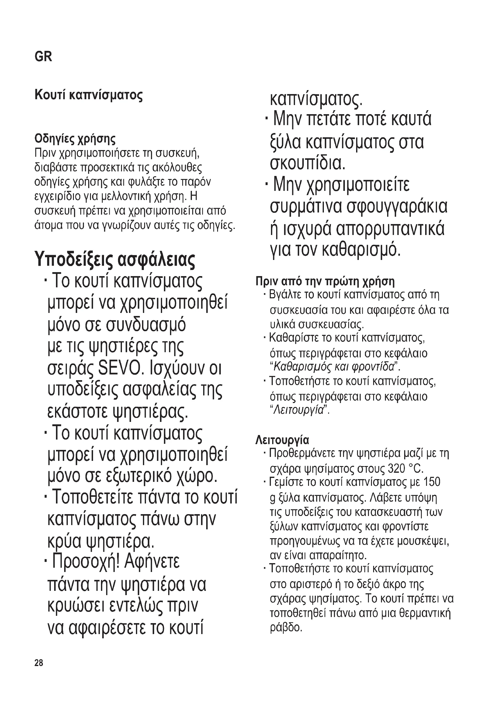 ∙ Κλείστε το κάλυμμα του κουτιού καπνίσματος και της συσκευής SEVO. ∙ Έπειτα από περίπου 8 λεπτά, ελέγξτε αν παράγεται αρκετός ορατός καπνός. ∙ Κλείστε το κάλυμμα και ρυθμίστε την ψηστιέρα στην επιθυμητή θερμοκρασία. Για τη ρύθμιση της θερμοκρασίας ανατρέξτε στη συνταγή. ∙ Περιμένετε λίγο, μέχρι να μειωθεί αρκετά η θερμοκρασία της ψηστιέρας, και τοποθετήστε τα τρόφιμα που θέλετε να καπνίσετε γύρω από το κουτί καπνίσματος. Τέλος, κλείστε ξανά το κάλυμμα της συσκευής SEVO. ∙ Η διάρκεια της διαδικασίας καπνίσματος εξαρτάται από τα τρόφιμα και τα ξύλα καπνίσματος που χρησιμοποιείτε. Λάβετε υπόψη τη συνταγή και τα στοιχεία του κατασκευαστή των ξύλων καπνίσματος. ∙ Αν η διαδικασία καπνίσματος έχει αρκετά μεγάλη διάρκεια, ελέγχετε κατά διαστήματα την παραγωγή καπνού και προσθέστε ξύλα, αν παρατηρήσετε μεγάλη μείωση της παραγωγής καπνού. ∙ Προσοχή! Για να προσθέσετε ξύλα καπνίσματος κατά τη διάρκεια της διαδικασίας καπνίσματος, φορέστε οπωσδήποτε ειδικά γάντια ψησίματος με υψηλή αντοχή στη θερμοκρασία! Καθαρισμός και φροντίδα ∙ Προσοχή! Αφήνετε πάντα την ψηστιέρα να κρυώσει εντελώς πριν να αφαιρέσετε το κουτί καπνίσματος. ∙ Μετά από κάθε χρήση, καθαρίζετε πάντα το κουτί καπνίσματος αφού