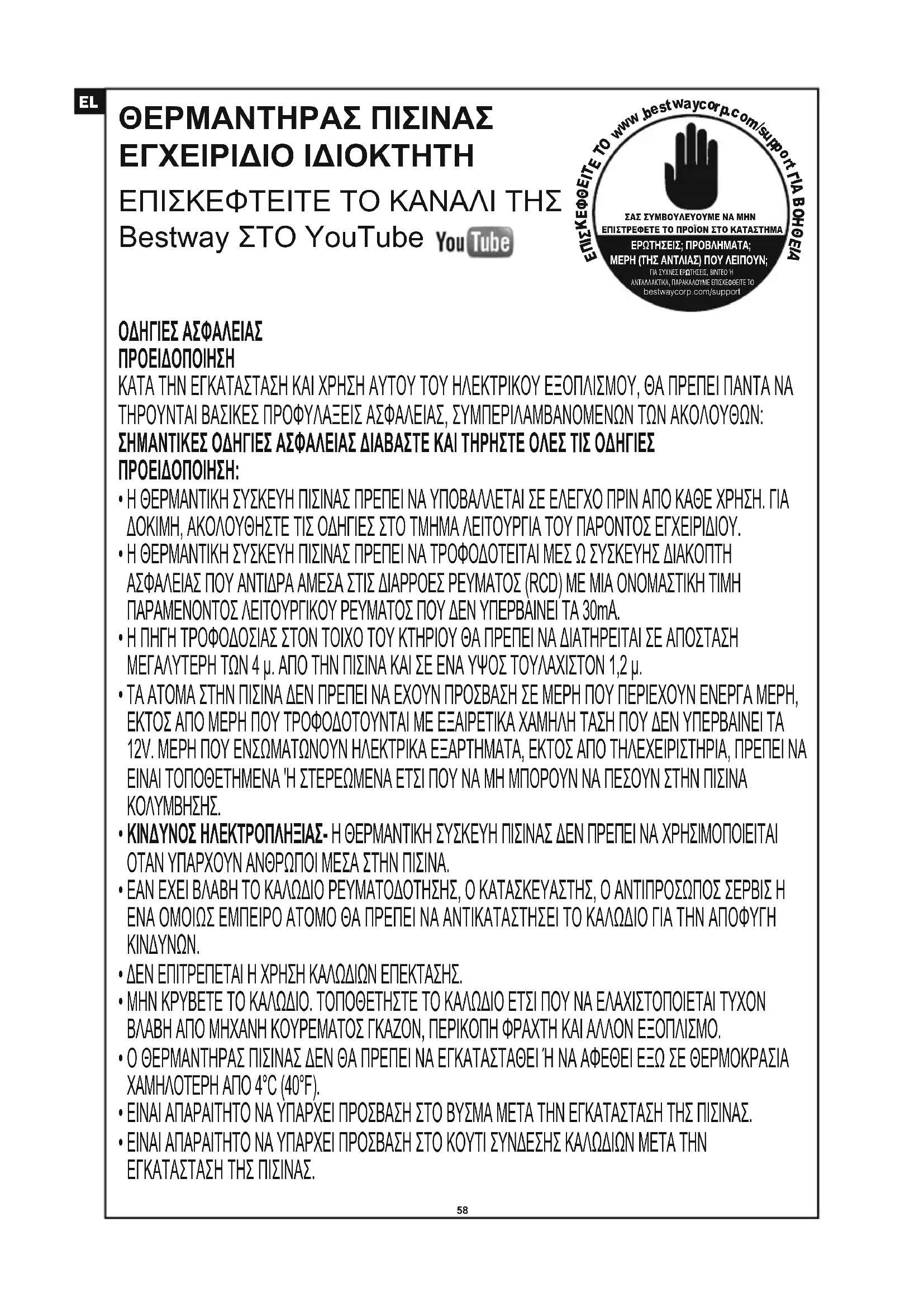 ΘΕΡΜΑΝΤΗΡΑΣ ΠΙΣΙΝΑΣ ΕΓΧΕΙΡIΔΙΟ ΙΔΙΟΚΤΗΤΗ ΕΠΙΣΚΕΦΤΕΙΤΕ ΤΟ ΚΑΝΑΛΙ ΤΗΣ Bestway ΣΤΟ YouTube ΣΑΣ ΣΥΜΒΟΥΛΕΥΟΥΜΕ ΝΑ ΜΗΝΕΠΙΣΤΡΕΦΕΤΕ ΤΟ ΠΡΟΪΟΝ ΣΤΟ ΚΑΤΑΣΤΗΜΑΕΡΩΤΗΣΕΙΣ; ΠΡΟΒΛΗΜΑΤΑ;ΜΕΡΗ (ΤΗΣ ΑΝΤΛΙΑΣ) ΠΟΥ ΛΕΙΠΟΥΝ; ΓΙΑ ΣΥΧΝΕΣ ΕΡΩΤΗΣΕΙΣ, ΒΙΝΤΕΟ Ή ΑΝΤΑΛΛΑΚΤΙΚΑ, ΠΑΡΑΚΑΛΟΥΜΕ ΕΠΙΣΚΕΦΘΕΙΤΕ ΤΟ bestwaycorp.com/support