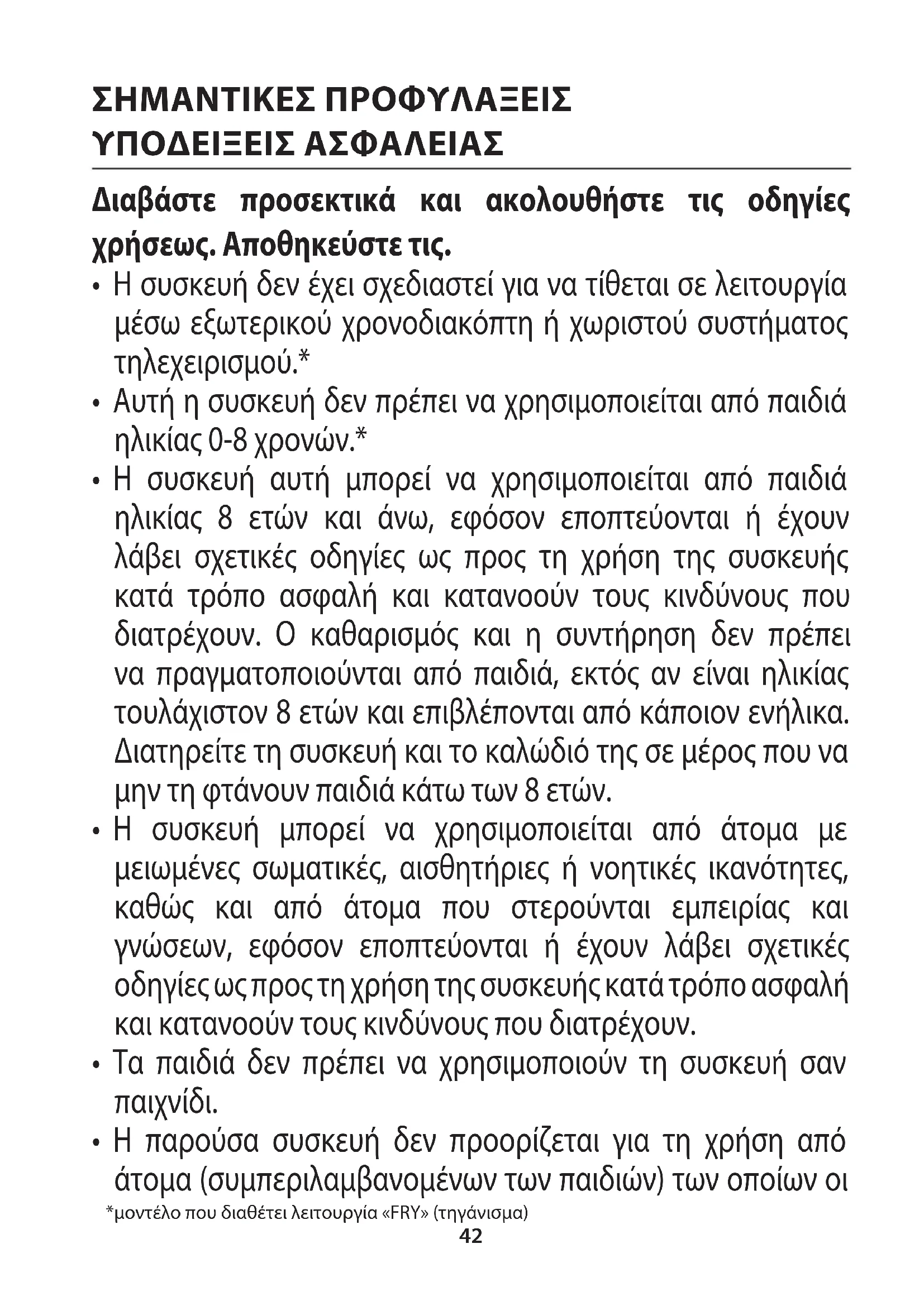 - Η παρούσα συσκευή δεν προορίζεται για τη χρήση από άτομα (συμπεριλαμβανομένων των παιδιών) των οποίων οι *μοντέλο που διαθέτει λειτουργία «FRY» (τηγάνισμα) ΣΗΜΑΝΤΙΚΕΣ ΠΡΟΦΥΛΑΞΕΙΣ ΥΠΟΔΕΙΞΕΙΣ ΑΣΦΑΛΕΙΑΣ 42σωματικές, αισθητήριες ή πνευματικές ικανότητές τους είναι μειωμένες, ή άτομα που στερούνται εμπειρίας ή γνώσης, χωρίς την επίβλεψη ενός ατόμου το οποίο θα είναι υπεύθυνο για την ασφάλειά τους, καθώς και την τήρηση των οδηγιών που αφορούν τη χρήση της συσκευής.
