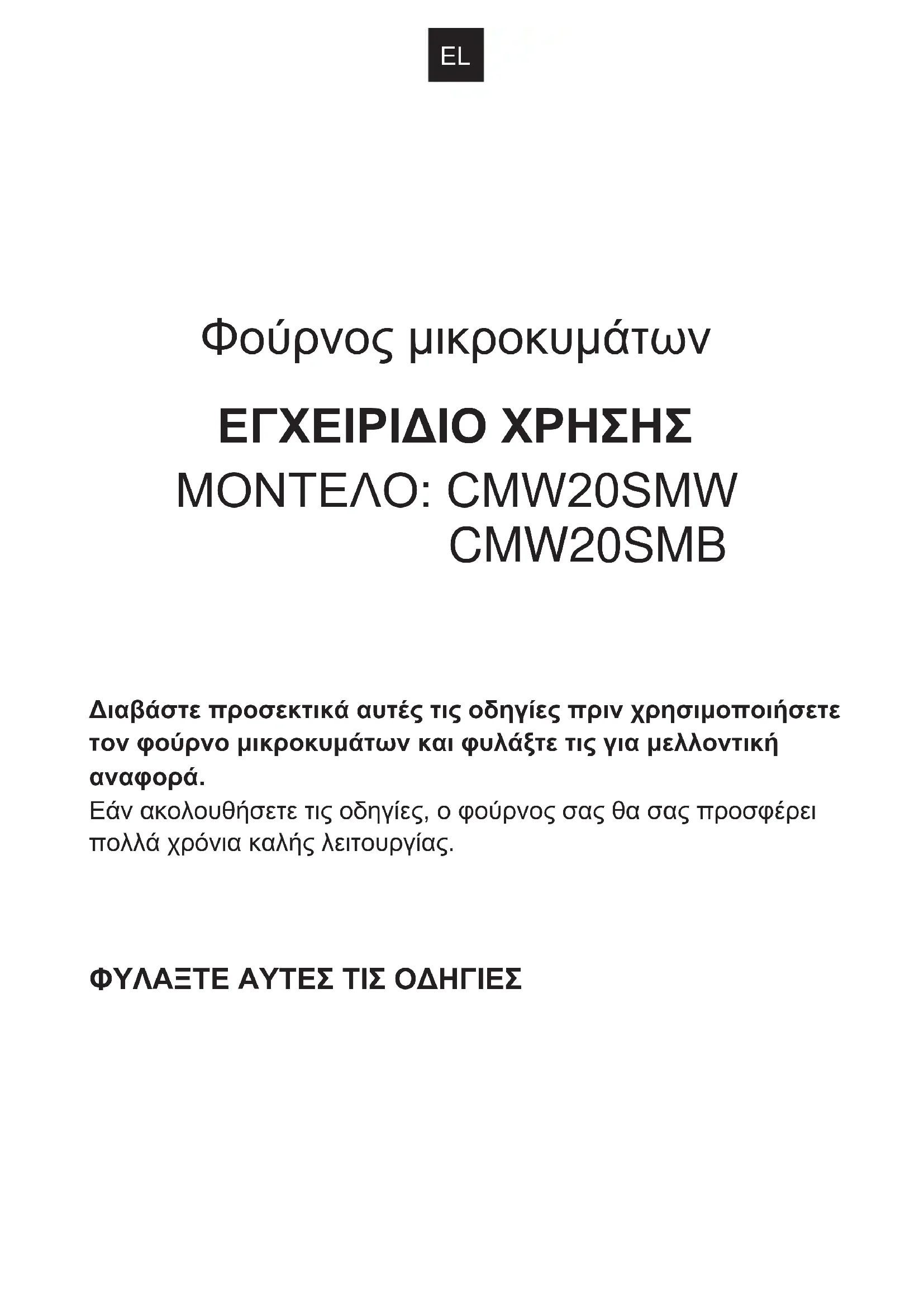 Φούρνος μικροκυμάτων ΕΓΧΕΙΡΙΔΙΟ ΧΡΗΣΗΣ ΜΟΝΤΕΛΟ: CMW20SMW CMW20SMB Διαβάστε προσεκτικά αυτές τις οδηγίες πριν χρησιμοποιήσετε τον φούρνο μικροκυμάτων και φυλάξτε τις για μελλοντική