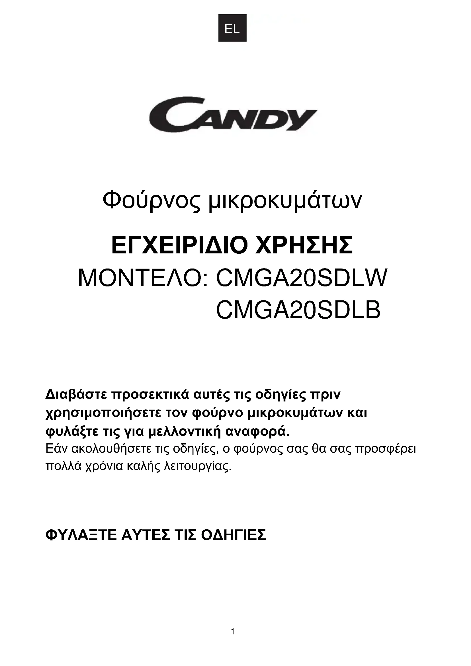 Φούρνος μικροκυμάτων ΕΓΧΕΙΡΙΔΙΟ ΧΡΗΣΗΣ ΜΟΝΤΕΛΟ: CMGA20SDLW CMGA20SDLB Διαβάστε προσεκτικά αυτές τις οδηγίες πριν χρησιμοποιήσετε τον φούρνο μικροκυμάτων και φυλάξτε τις για μελλοντική αναφορά. Εάν ακολουθήσετε τις οδηγίες, ο φούρνος σας θα σας προσφέρει πολλά χρόνια καλής λειτουργίας. ΦΥΛΑΞΤΕ ΑΥΤΕΣ ΤΙΣ ΟΔΗΓΙΕΣEL