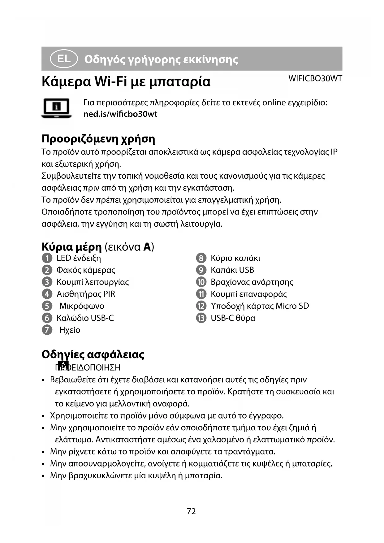 Οδηγός γρήγορης εκκίνησης Κάμερα Wi-Fi με μπαταρία WIFICBO30WTΓια περισσότερες πληροφορίες δείτε το εκτενές online εγχειρίδιο: ned.is/wicbo30wt Προοριζόμενη χρήση Το προϊόν αυτό προορίζεται αποκλειστικά ως κάμερα ασφαλείας τεχνολογίας IP και εξωτερική χρήση.Συμβουλευτείτε την τοπική νομοθεσία και τους κανονισμούς για τις κάμερες ασφάλειας πριν από τη χρήση και την εγκατάσταση.Το προϊόν δεν πρέπει χρησιμοποιείται για επαγγελματική χρήση.Οποιαδήποτε τροποποίηση του προϊόντος μπορεί να έχει επιπτώσεις στην ασφάλεια, την εγγύηση και τη σωστή λειτουργία. Κύρια μέρη (εικόνα A) 1 LED ένδειξη 2 Φακός κάμερας 3 Κουμπί λειτουργίας 4 Αισθητήρας PIR 5 Μικρόφωνο 6 Καλώδιο USB-C 7 Ηχείο 8 Κύριο καπάκι 9 Καπάκι USB q Βραχίονας ανάρτησης w Κουμπί επαναφοράς e Υποδοχή κάρτας Micro SD r USB-C θύρα Οδηγίες ασφάλειας