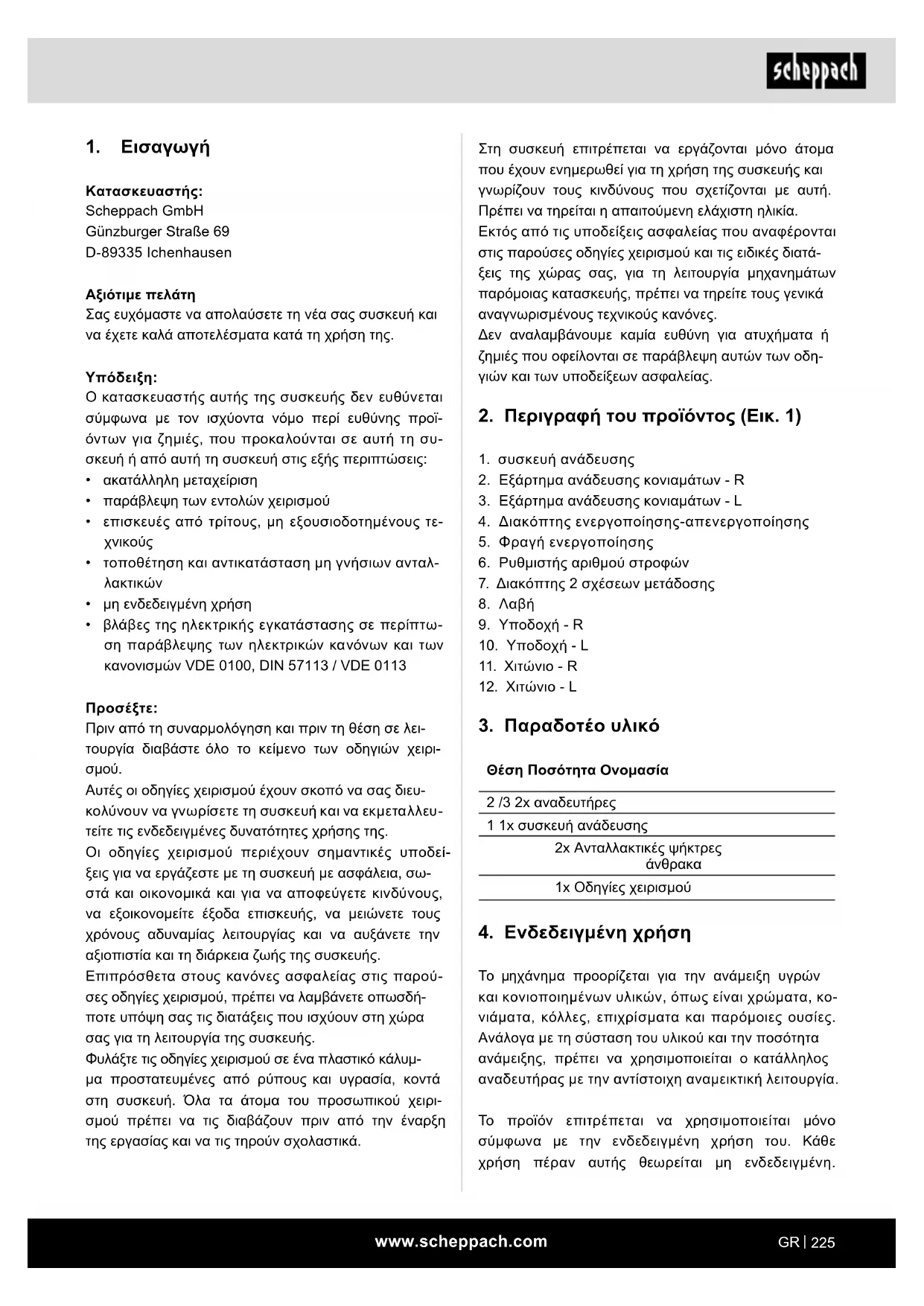 Κατασκευαστής: Scheppach GmbH Günzburger Straße 69 D-89335 Ichenhausen Αξιότιμε πελάτη Σας ευχόμαστε να απολαύσετε τη νέα σας συσκευή και να έχετε καλά αποτελέσματα κατά τη χρήση της.