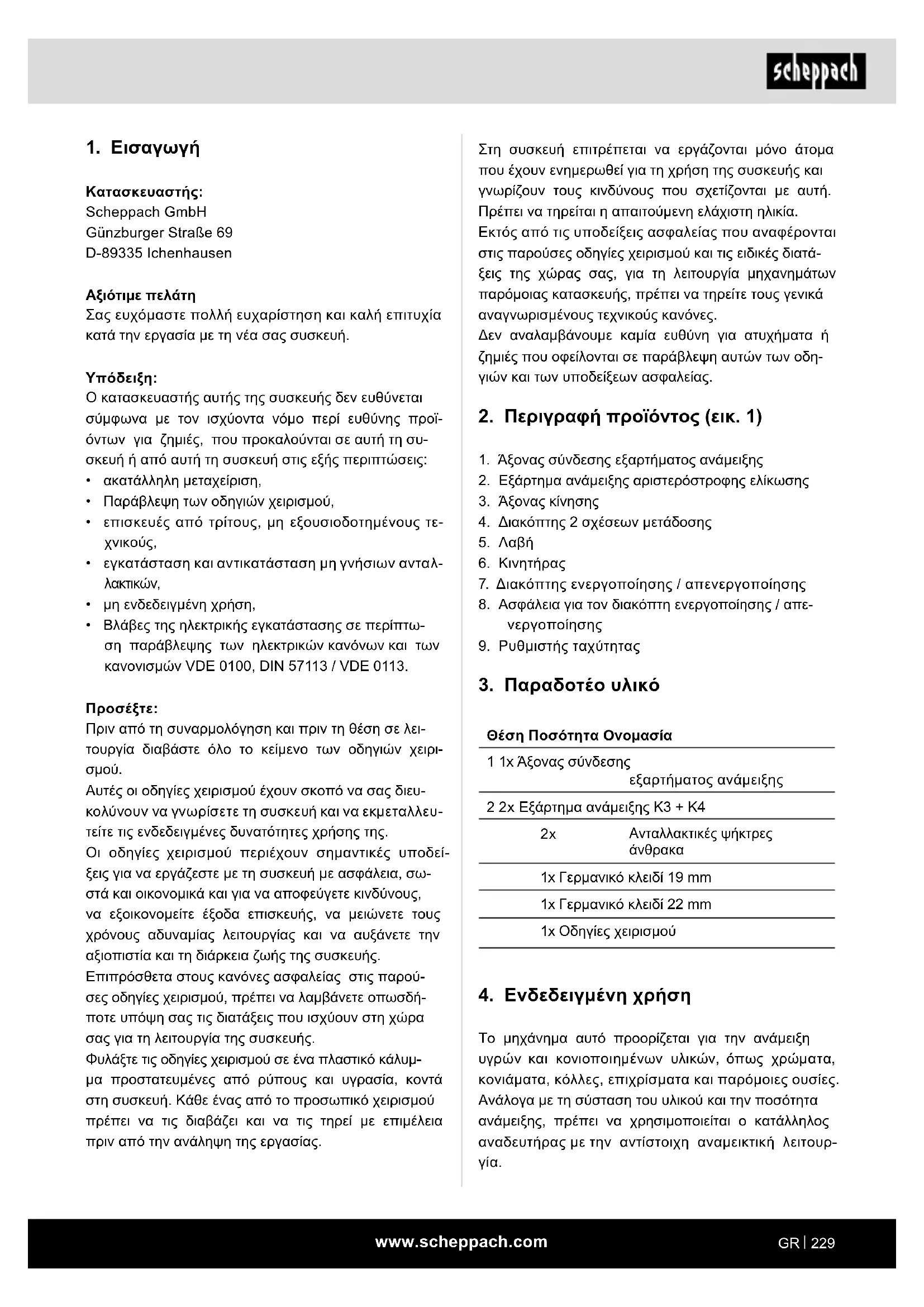 Κατασκευαστής: Scheppach GmbH Günzburger Straße 69 D-89335 Ichenhausen Αξιότιμε πελάτη Σας ευχόμαστε πολλή ευχαρίστηση και καλή επιτυχία κατά την εργασία με τη νέα σας συσκευή.