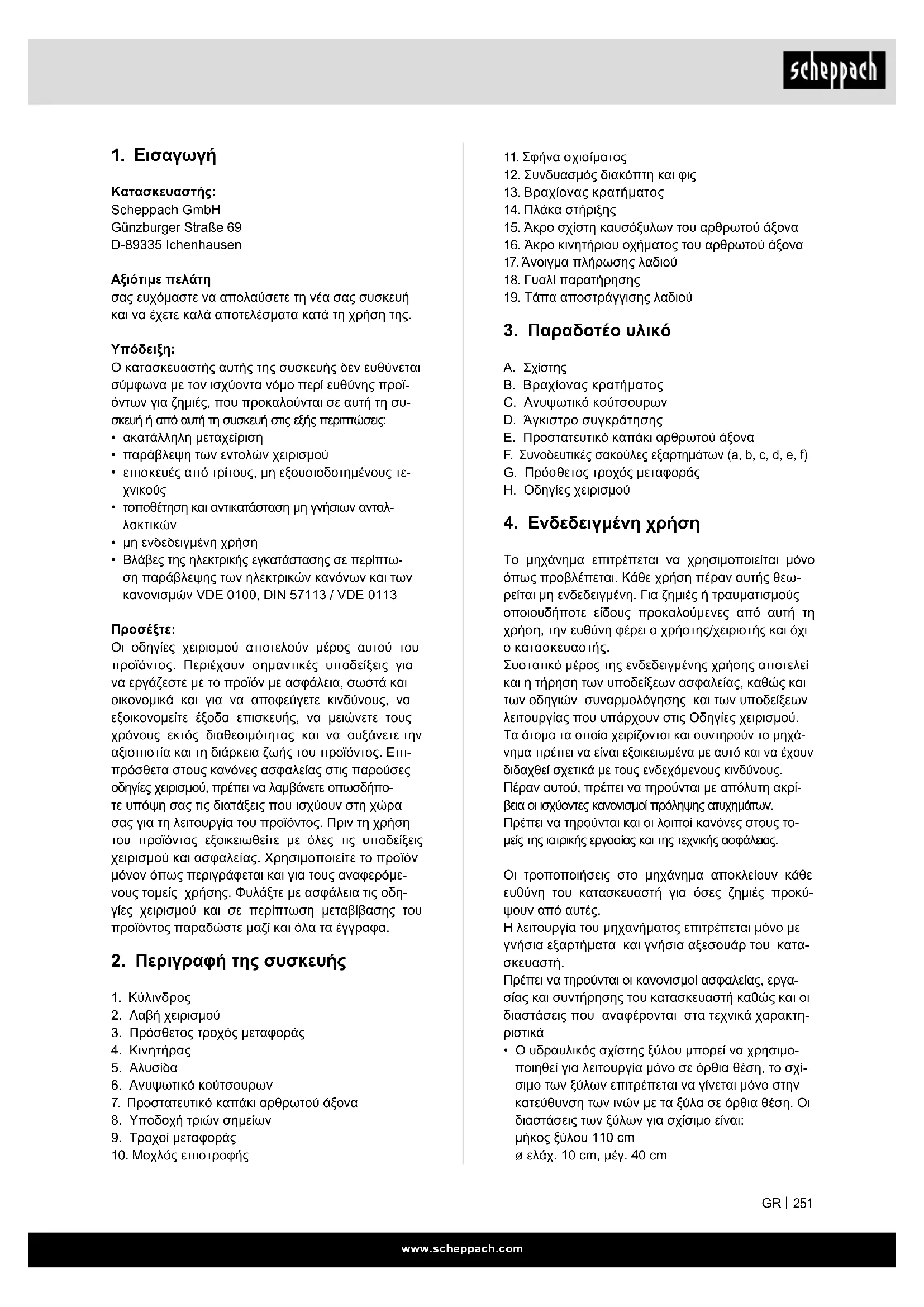 Κατασκευαστής: Scheppach GmbH Günzburger Straße 69 D-89335 Ichenhausen Αξιότιμε πελάτη σας ευχόμαστε να απολαύσετε τη νέα σας συσκευή και να έχετε καλά αποτελέσματα κατά τη χρήση της.