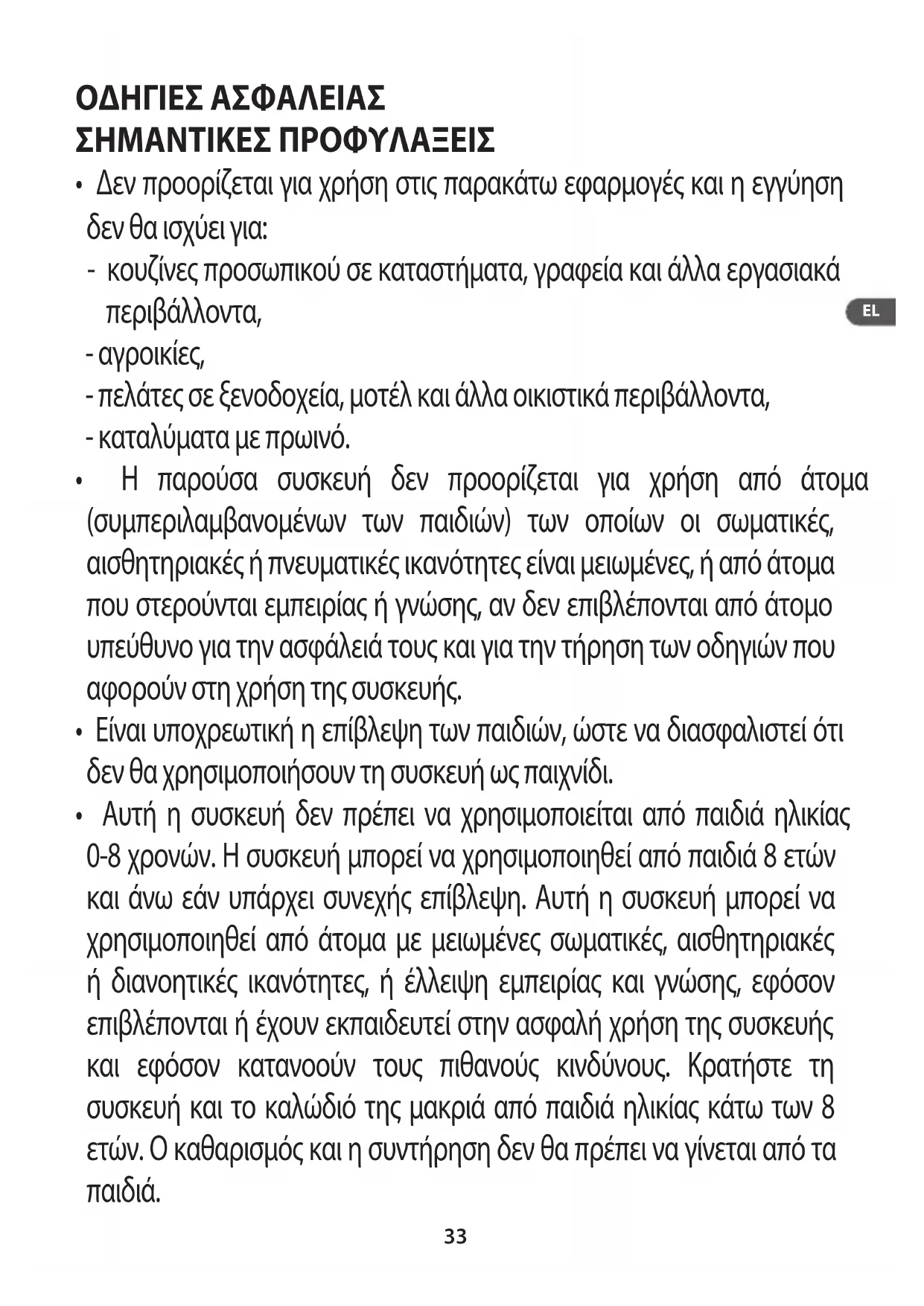 - Η παρούσα συσκευή δεν προορίζεται για χρήση από άτομα (συμπεριλαμβανομένων των παιδιών) των οποίων οι σωματικές, αισθητηριακές ή πνευματικές ικανότητες είναι μειωμένες, ή από άτομα που στερούνται εμπειρίας ή γνώσης, αν δεν επιβλέπονται από άτομο υπεύθυνο για την ασφάλειά τους και για την τήρηση των οδηγιών που αφορούν στη χρήση της συσκευής.