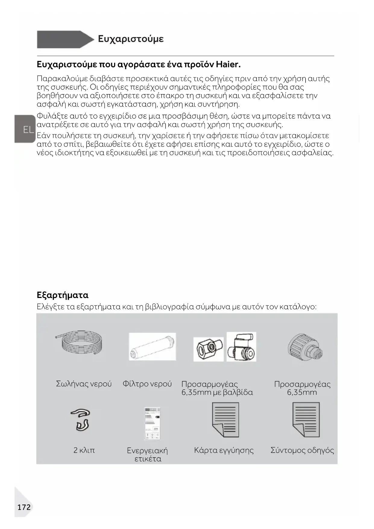 Ευχαριστούμε που αγοράσατε ένα προϊόν Haier. Παρακαλούμε διαβάστε προσεκτικά αυτές τις οδηγίες πριν από την χρήση αυτής της συσκευής. Οι οδηγίες περιέχουν σημαντικές πληροφορίες που θα σας βοηθήσουν να αξιοποιήσετε στο έπακρο τη συσκευή και να εξασφαλίσετε την ασφαλή και σωστή εγκατάσταση, χρήση και συντήρηση. Φυλάξτε αυτό το εγχειρίδιο σε μια προσβάσιμη θέση, ώστε να μπορείτε πάντα να ανατρέξετε σε αυτό για την ασφαλή και σωστή χρήση της συσκευής. Εάν πουλήσετε τη συσκευή, την χαρίσετε ή την αφήσετε πίσω όταν μετακομίσετε από το σπίτι, βεβαιωθείτε ότι έχετε αφήσει επίσης και αυτό το εγχειρίδιο, ώστε ο νέος ιδιοκτήτης να εξοικειωθεί με τη συσκευή και τις προειδοποιήσεις ασφαλείας.