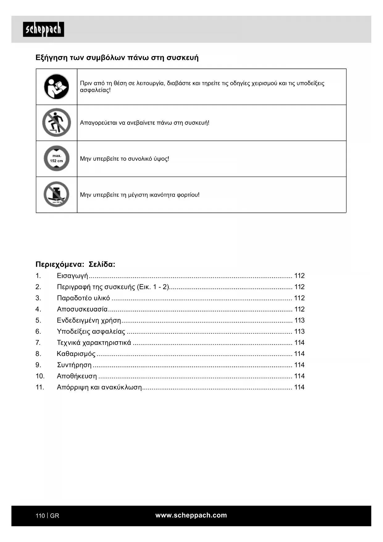 Απαγορεύεται να ανεβαίνετε πάνω στη συσκευή! max. 152 cm Μην υπερβείτε το συνολικό ύψος! max. 250 kg Μην υπερβείτε τη μέγιστη ικανότητα φορτίου! Περιεχόμενα: Σελίδα: 1. Εισαγωγή ........................................................................................................... 112