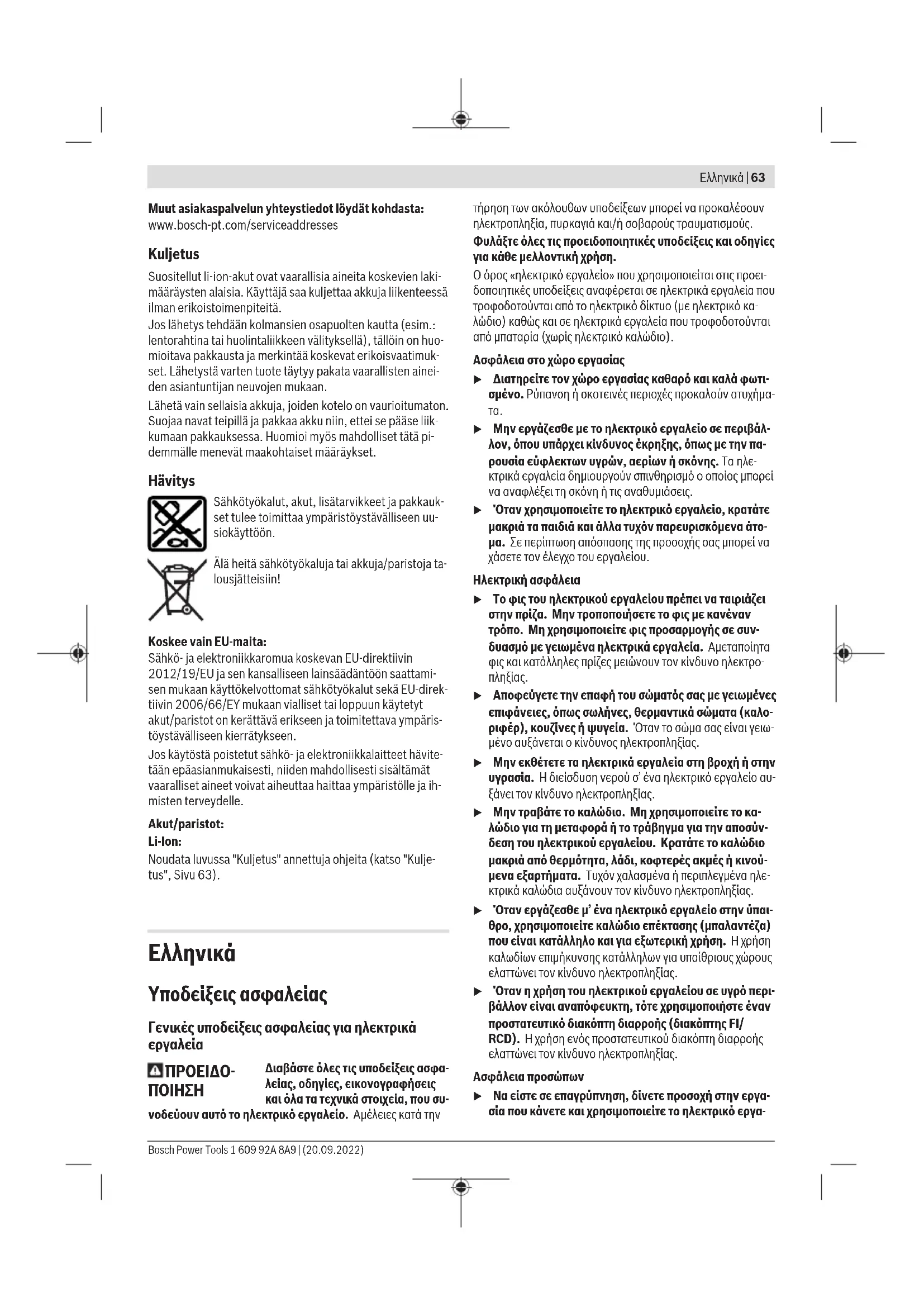 Οι συνιστώμενες μπαταρίες ιόντων λιθίου υπόκεινται στις απαι- τήσεις των επικίνδυνων αγαθών. Οι μπαταρίες μπορούν να με- ταφερθούν οδικώς από τον χρήστη χωρίς άλλους όρους. Όταν, όμως, οι μπαταρίες αποστέλλονται από τρίτους (π.χ. αε- ροπορικώς ή με εταιρία μεταφορών) πρέπει να τηρούνται διάφορες ιδιαίτερες απαιτήσεις για τη συσκευασία και τη σή- μανση. Εδώ πρέπει, κατά την προετοιμασία του τεμαχίου απο- στολής να ζητηθεί οπωσδήποτε και η συμβουλή ενός ειδικού για επικίνδυνα αγαθά. Αποστέλλετε τις μπαταρίες μόνο όταν το περίβλημα είναι άθι- κτο. Κολλάτε τις γυμνές επαφές με κολλητική ταινία και να συ- σκευάζετε την μπαταρία κατά τέτοιο τρόπο, ώστε αυτή να μην κουνιέται μέσα στη συσκευασία. Παρακαλούμε να λαμβάνετε επίσης υπόψη σας και τυχόν πιο αυστηρές εθνικές διατάξεις. 1 609 92A 8A9 | (20.09.2022) Bosch Power ToolsTürkçe | 69