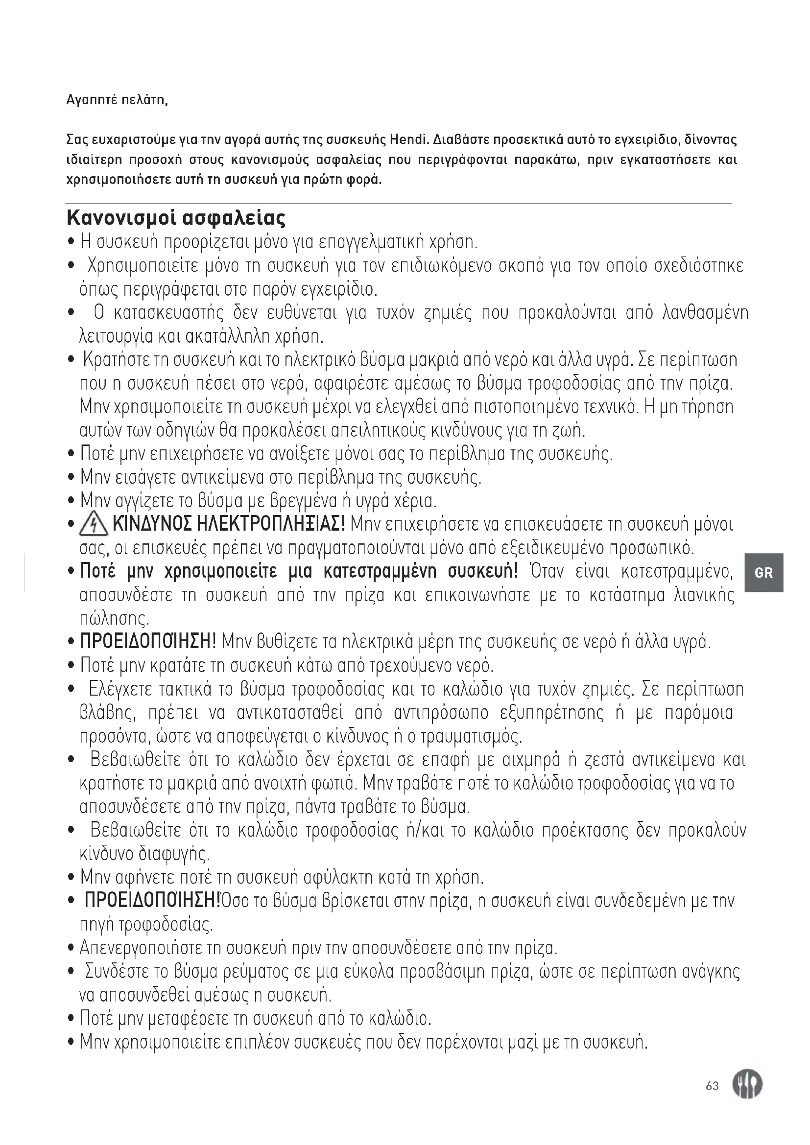 Αγαπητέ πελάτη, Σας ευχαριστούμε για την αγορά αυτής της συσκευής Hendi. Διαβάστε προσεκτικά αυτό το εγχειρίδιο, δίνοντας ιδιαίτερη προσοχή στους κανονισμούς ασφαλείας που περιγράφονται παρακάτω, πριν εγκαταστήσετε και χρησιμοποιήσετε αυτή τη συσκευή για πρώτη φορά. Κανονισμοί ασφαλείας