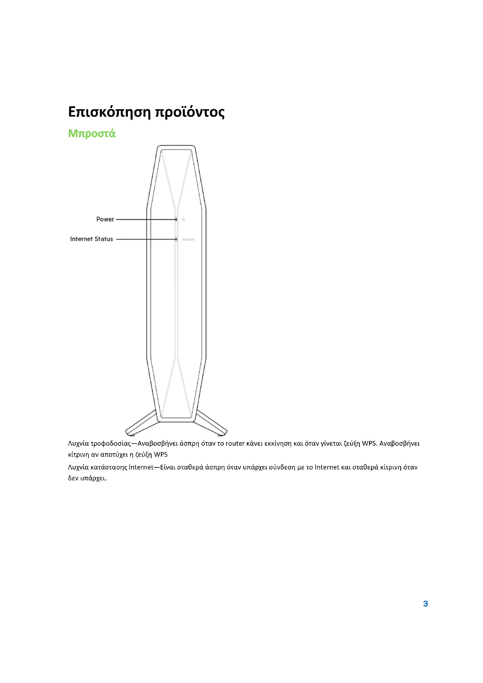 Λυχνία τροφοδοσίας—Αναβοσβήνει άσπρη όταν το router κάνει εκκίνηση και όταν γίνεται ζεύξη WPS. Αναβοσβήνει κίτρινη αν αποτύχει η ζεύξη WPS Λυχνία κατάστασης Internet—Είναι σταθερά άσπρη όταν υπάρχει σύνδεση με το Internet και σταθερά κίτρινη όταν δεν υπάρχει.4