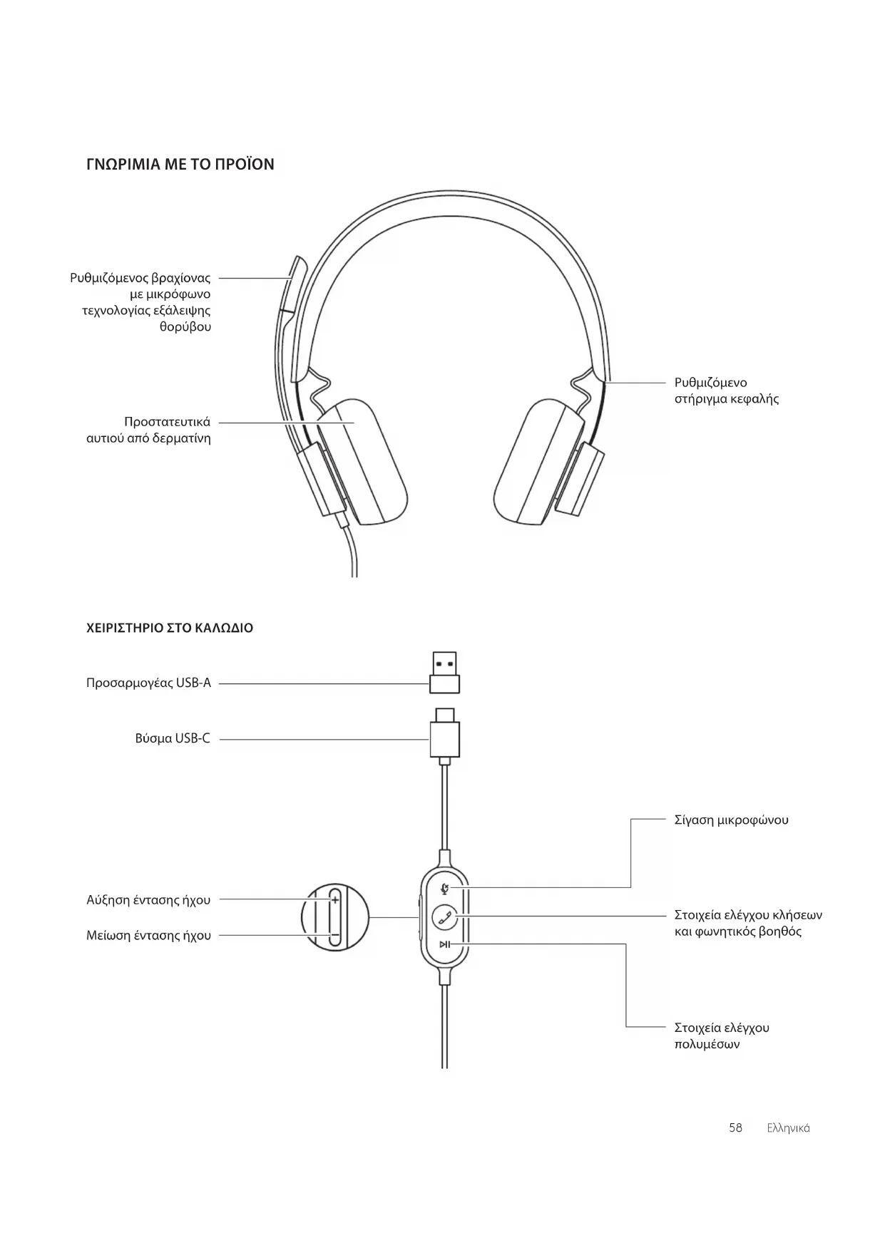 ΧΕΙΡΙΣΤΉΡΙΟ ΣΤΟ ΚΑΛΩΔΙΟ Σίγαση μικροφώνου Στοιχεία ελέγχου κλήσεων και φωνητικός βοηθός Αύξηση έντασης ήχου Μείωση έντασης ήχου Βύσμα USB-C Προσαρμογέας USB-A Στοιχεία ελέγχου