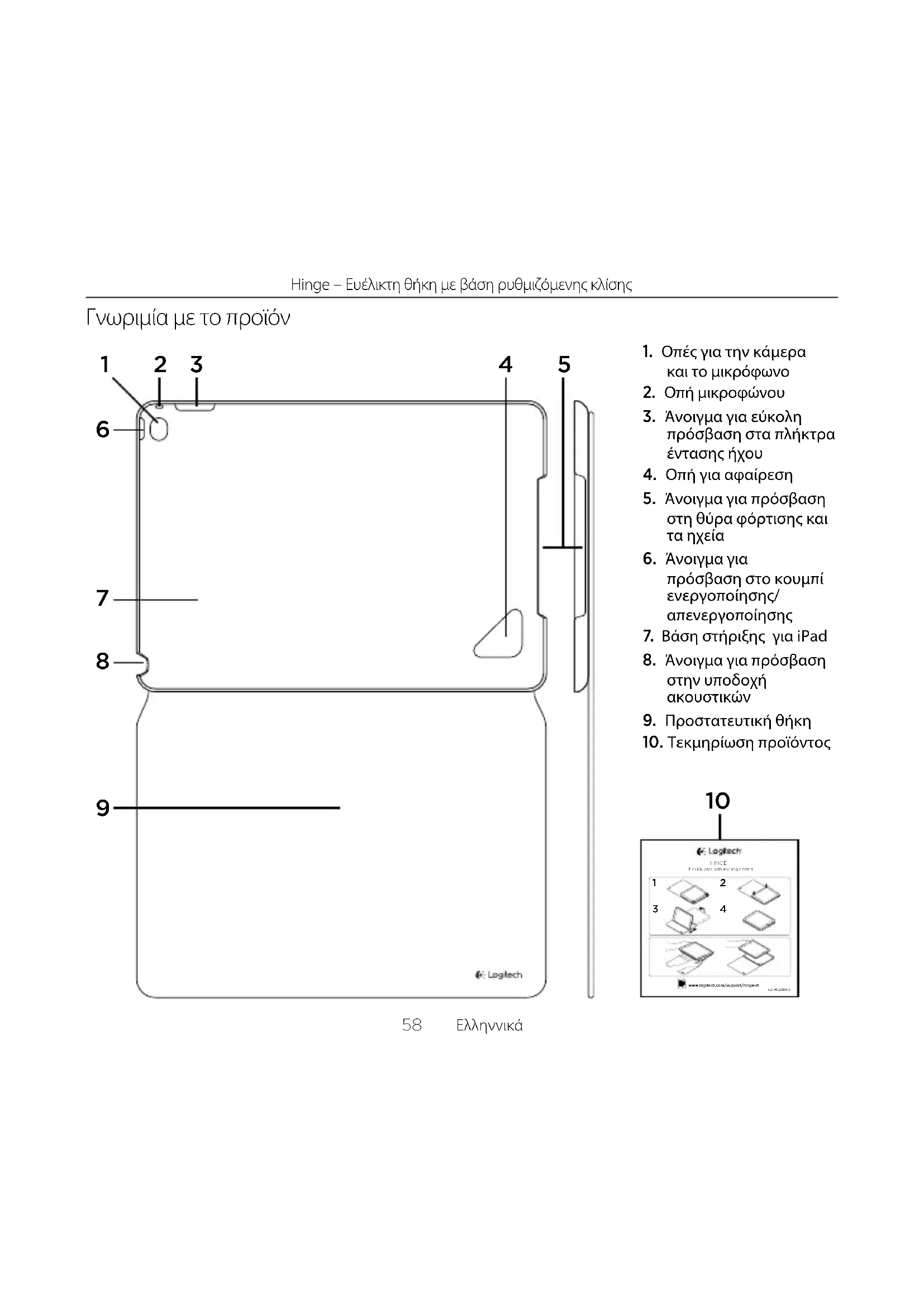 - Βεβαιωθείτε ότι έχετε τοποθετήσει τη σωστή πλευρά του iPad στη βάση στήριξης για iPad. Όταν το iPad έχει τοποθετηθεί σωστά, η κάμερα του iPad θα πρέπει να συμπίπτει με την οπή κάμερας. Ποια είναι η γνώμη σας; Αφιερώστε λίγο χρόνο για να μας πείτε. Σας ευχαριστούμε για την αγορά του προϊόντος μας. www.logitech.com/ithinkПо-русски 63 Hinge — гибкий чехол с подставкой, которая позволяет установить его под любым углом Знакомство с продуктом