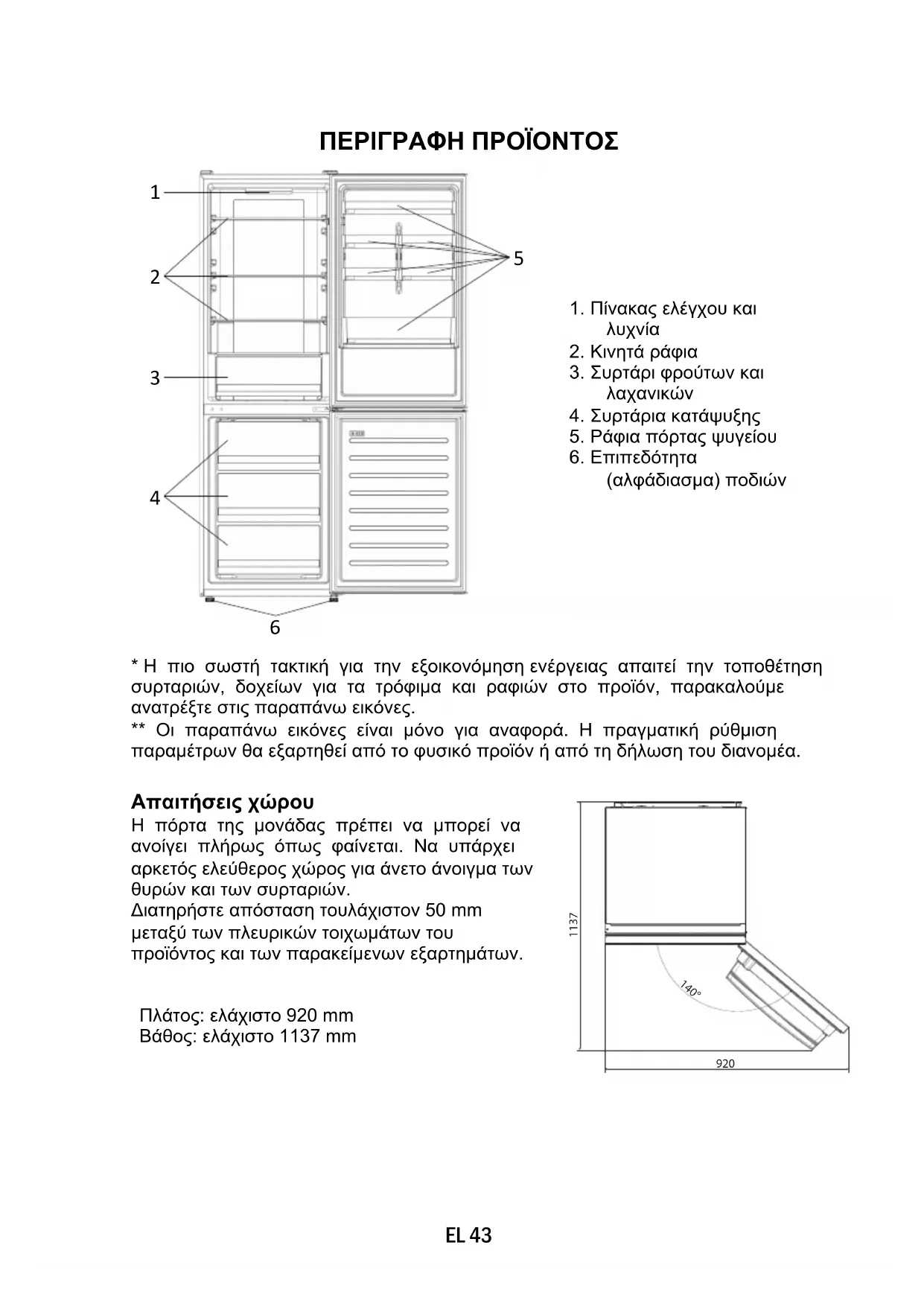 - Η πιο σωστή τακτική για την εξοικονόμηση ενέργειας απαιτεί την τοποθέτηση συρταριών, δοχείων για τα τρόφιμα και ραφιών στο προϊόν, παρακαλούμε ανατρέξτε στις παραπάνω εικόνες. ** Οι παραπάνω εικόνες είναι μόνο για αναφορά. Η πραγματική ρύθμιση παραμέτρων θα εξαρτηθεί από το φυσικό προϊόν ή από τη δήλωση του διανομέα. Απαιτήσεις χώρου Η πόρτα της μονάδας πρέπει να μπορεί να ανοίγει πλήρως όπως φαίνεται. Να υπάρχει αρκετός ελεύθερος χώρος για άνετο άνοιγμα των θυρών και των συρταριών. Διατηρήστε απόσταση τουλάχιστον 50 mm μεταξύ των πλευρικών τοιχωμάτων του προϊόντος και των παρακείμενων εξαρτημάτων. Πλάτος: ελάχιστο 920 mm Βάθος: ελάχιστο 1137 mm